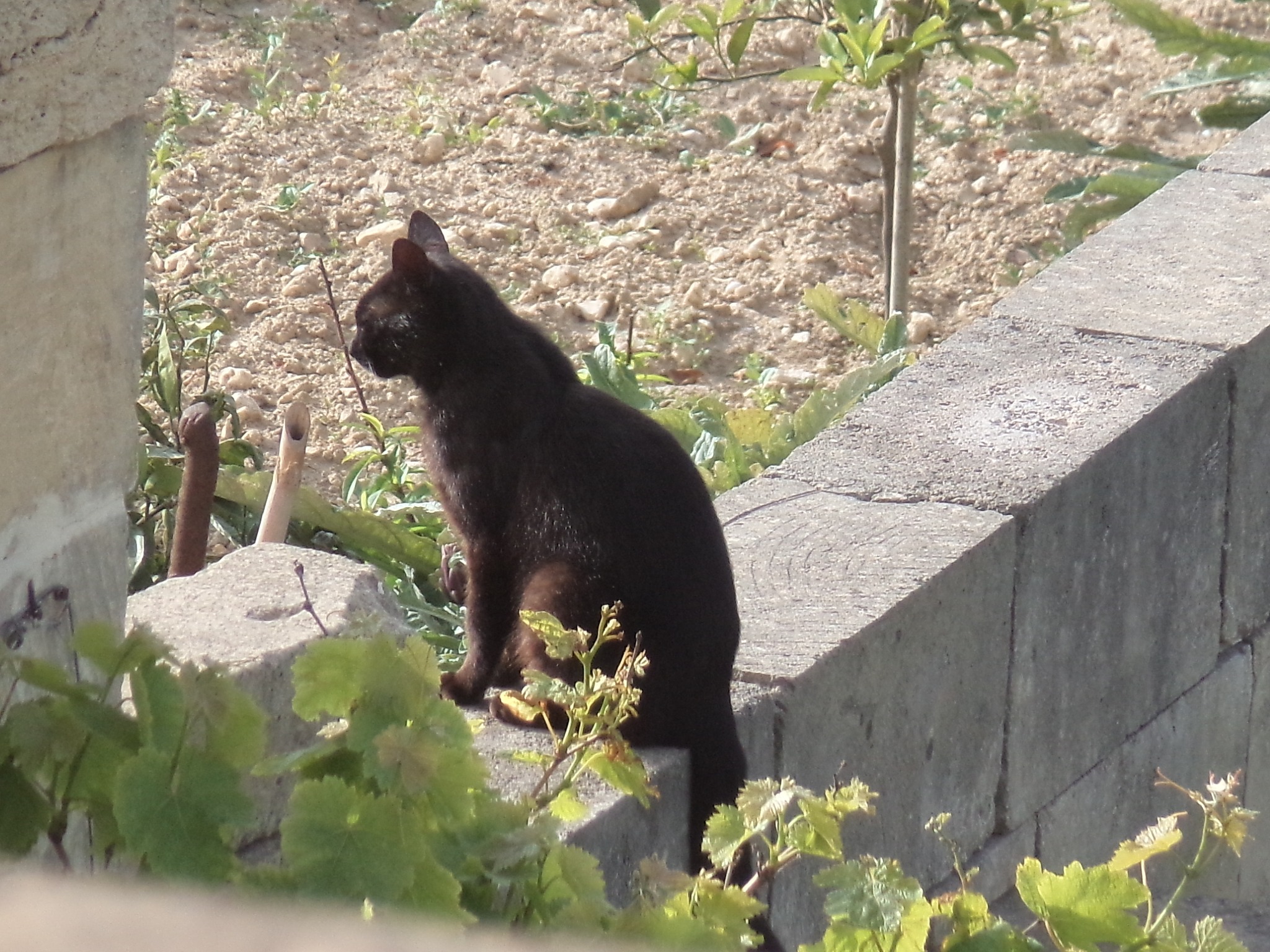 The first occurrence involved Visitor Cat who had come to the garden to eat. The Cat (who was highly skilled in the art of the surprise attack) promptly cornered Visitor under the water tank from where Visitor Cat escaped only when the humans arrived to diffuse the situation. To underline her point, The Cat then pursued Visitor through the garden until she left. In the months following, this plant-ledge was as close as Visitor felt was safe, but with some dry food on the top of the wall as snacks (as pictured in the header photo) plus bowls brought to her at feeding times, she managed to visit regularly for food while not incensing the matriarch of the garden.