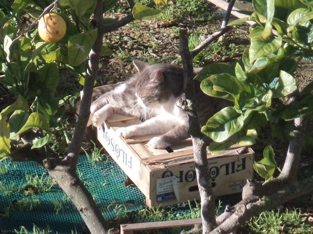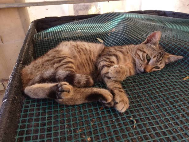 Dinky was a friendly cat who had been dumped in the fields and came looking for food. One particular day he arrived walking awkwardly. After eating, he went to wash as usual and we noticed that he was unable to sit down – instead, he stood with his back to the wall and tried (unsuccessfully) to slide his back end down the wall to the ground. Obviously in pain, he took refuge in one of the pods, hiding at the back behind the netting which he piled up in the doorway so no one could see in. He was obviously very unhappy and, having observed him, we concluded that he had suffered a tail avulsion (aka tail pull or forceful pulling of the tail, causing soft tissue and nerve damage); our guess was that, cornered by another male in the field, Dinky turned round to run away (he wasn’t a fighter), and the other cat sunk his claws or teeth into Dinky’s tail, pulling it back as Dinky ran forward.