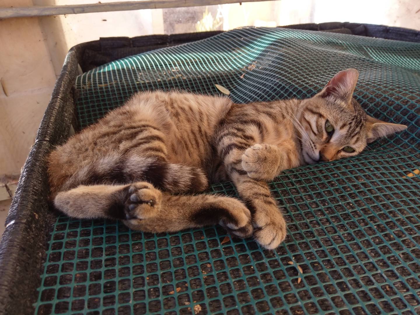 Mr Tiffin was a feral cat from the fields who visited The Cat’s garden for food and water, but, due to his feral nature, generally at times when the humans were not there. One day he arrived to eat, hopping and limping with his back leg. We were not able to approach him, but from observing him walking and trying to jump, we suspected he had dislocated his hip. Despite being in pain, he managed well (almost as though it was not the first time this had happened) and after a day or two, he started to gingerly put weight on his bad leg.