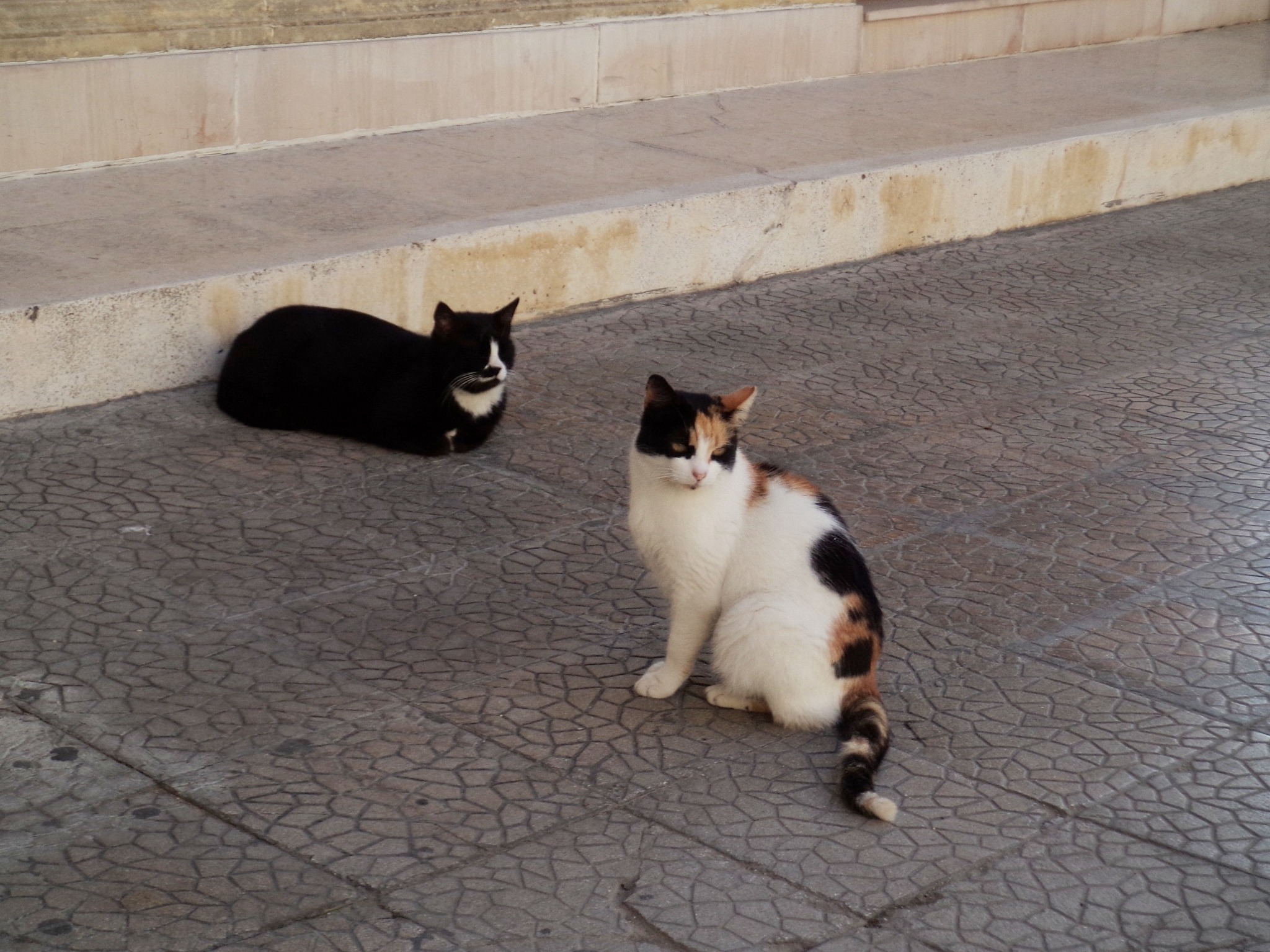 …and these two fine felines are to be found down the road from the bus station, strategically positioned near the first food kiosks that the tourists find. There is water and dry food outside the front door of this house, and boxes with cosy liners in which the cats may sleep and shelter.