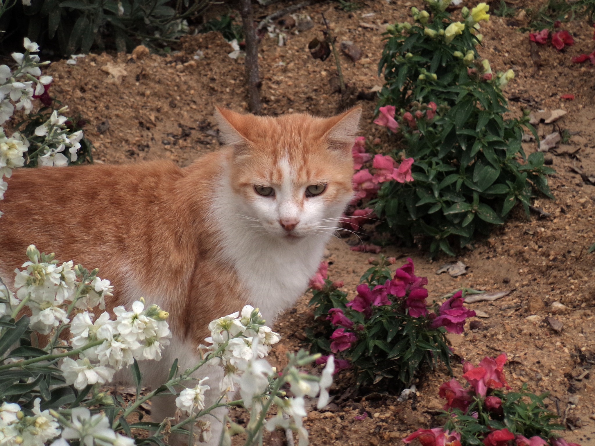 The cats who live in the town gardens are fed by local feeders and taken care of by our local SPCA. People using the gardens love to share a bench with a cat and interact with them. First is this handsome cat, admiring the snapdragons…