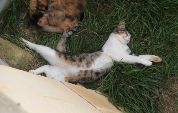 Firstborn was Tabby, litter-mate to Ginge, Blackie and Splodge (whose colours are explained by their names). The Cat and her family were not yet friendly so we didn’t know whether The Cat’s kittens were male or female; the kittens spent their early weeks in the fields and The Cat brought them to the garden for weaning.
