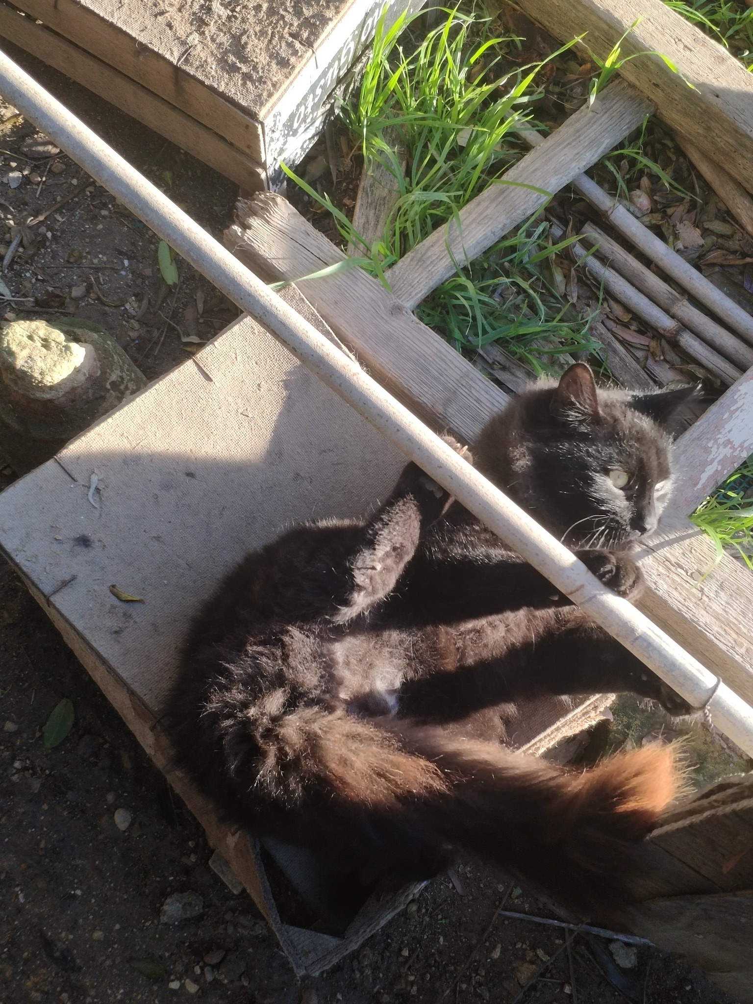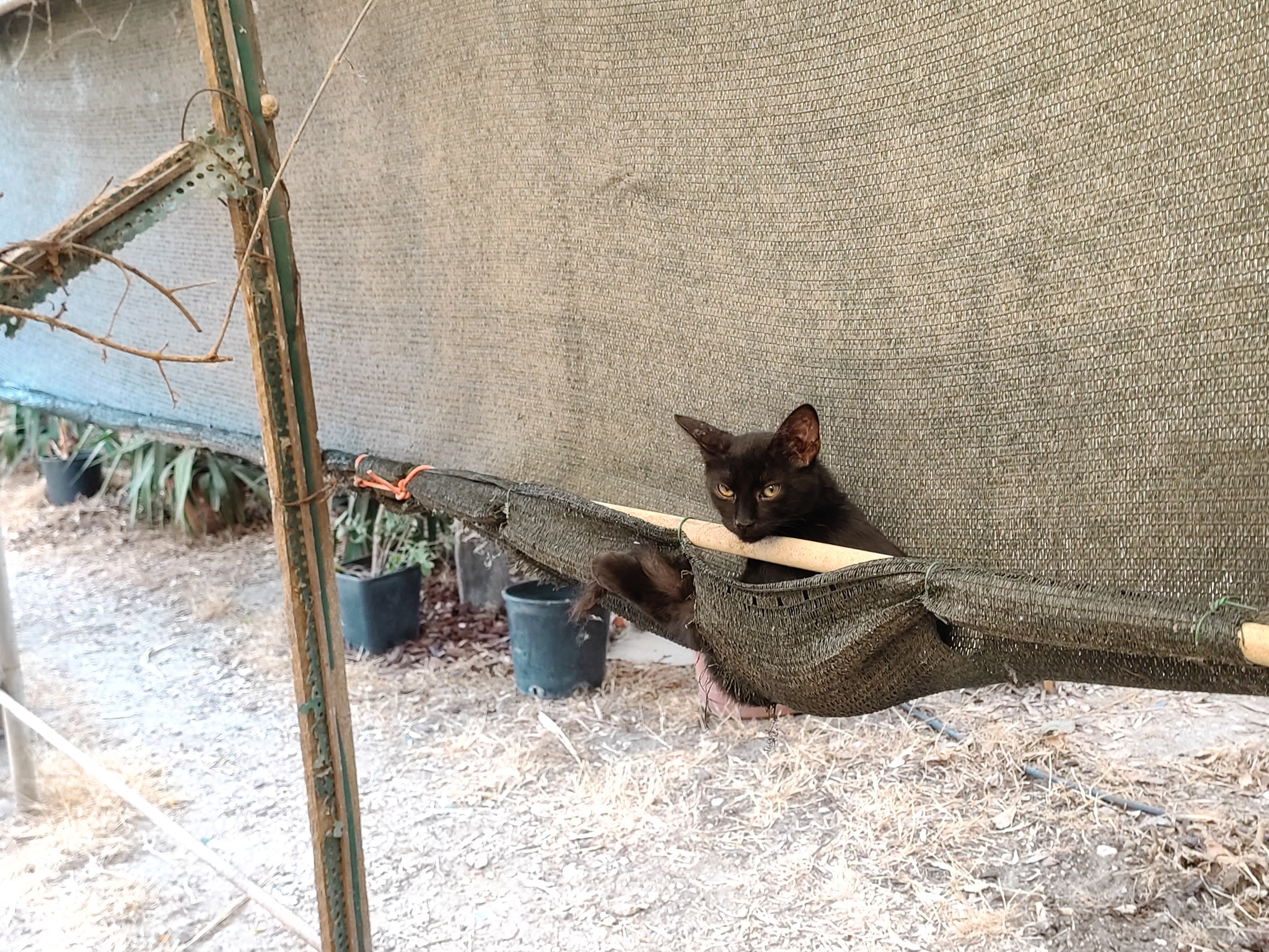 We had erected a shade cloth barrier to reduce the direct sun in the summer; the shade cloth was turned up and over the bottom rail and fixed with cable ties, but obviously someone thought that they could re-purpose the bottom seam to make the perfect hammock. The life of the shade cloth had been considerably reduced, but Raven looked so proud of himself with his tail and one back leg poking out that it was impossible to be annoyed with him.