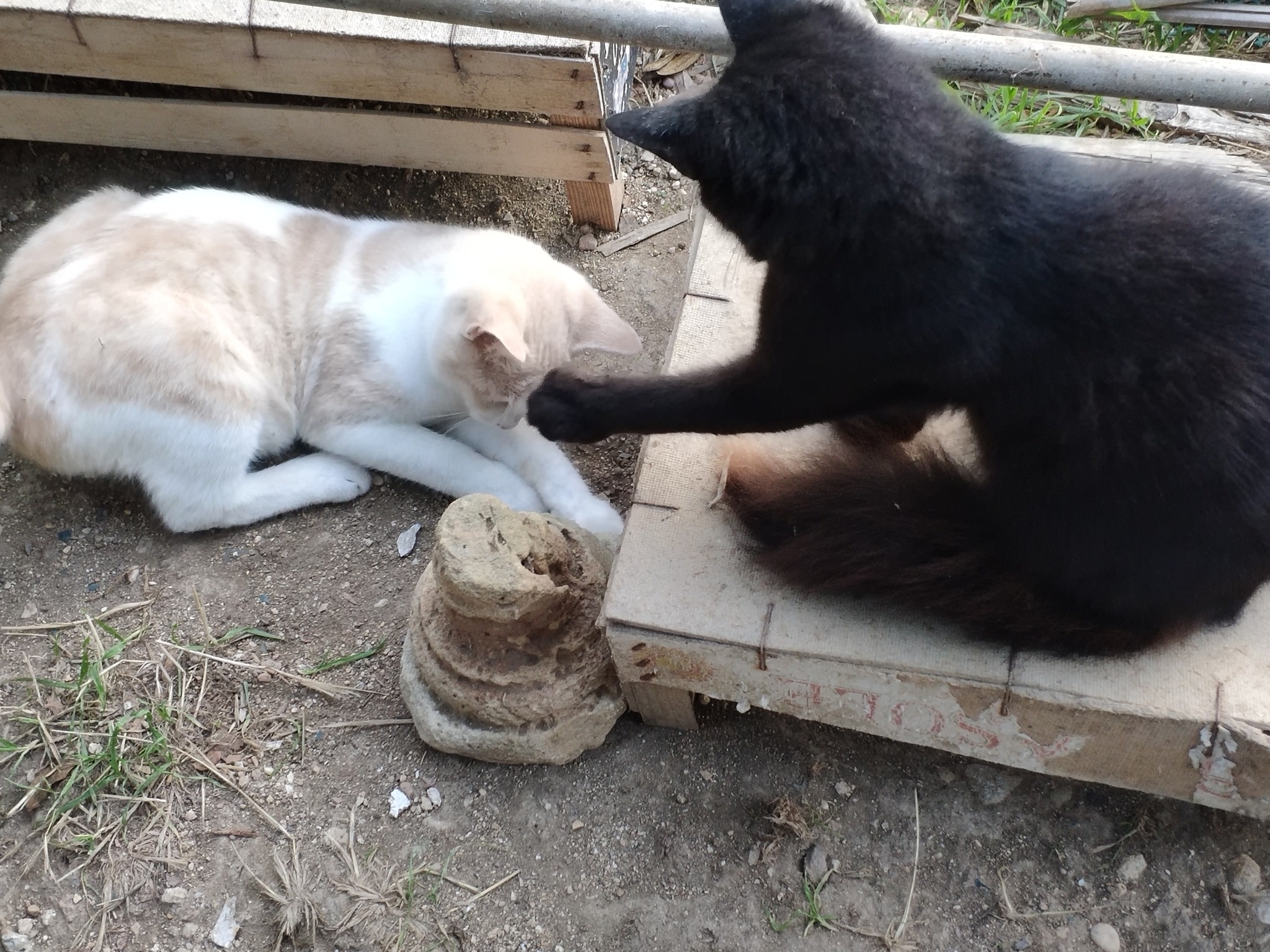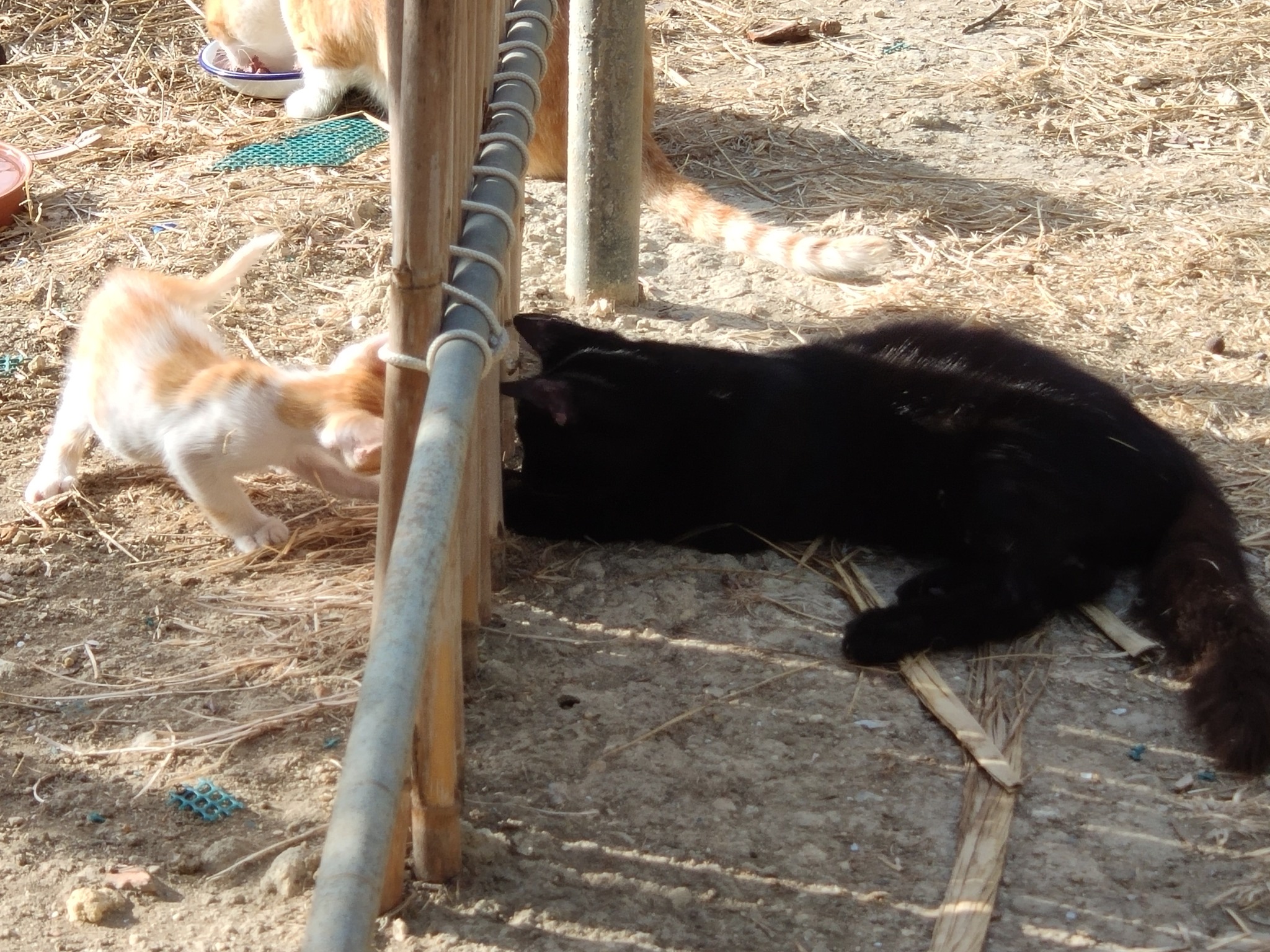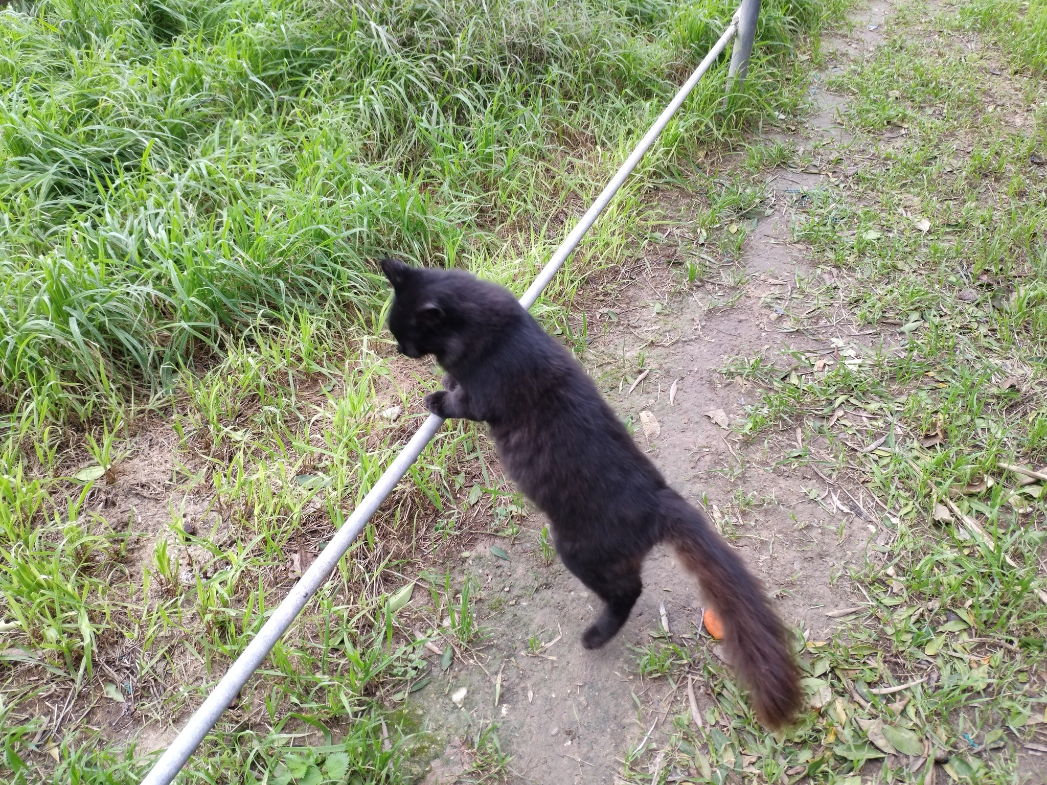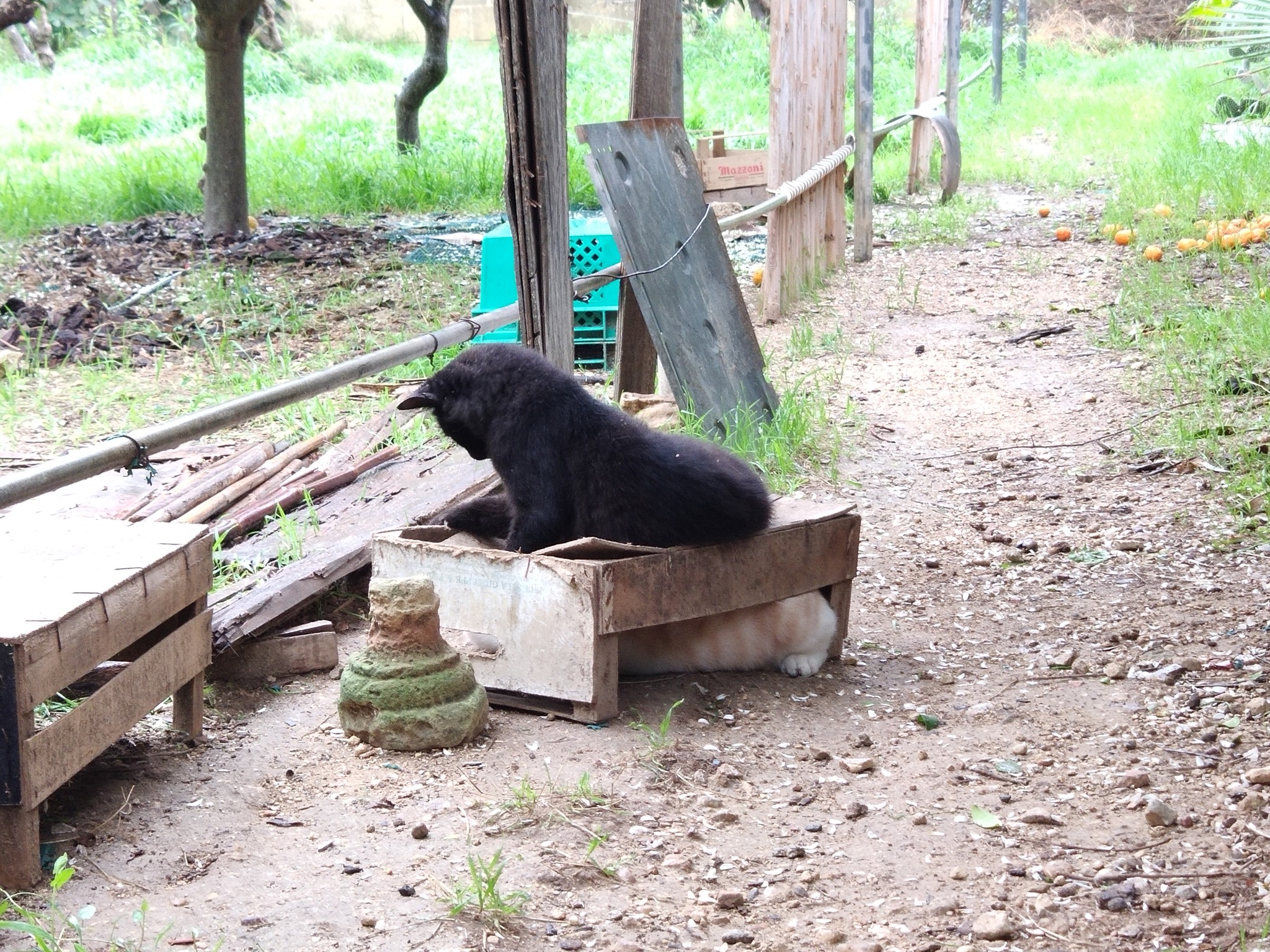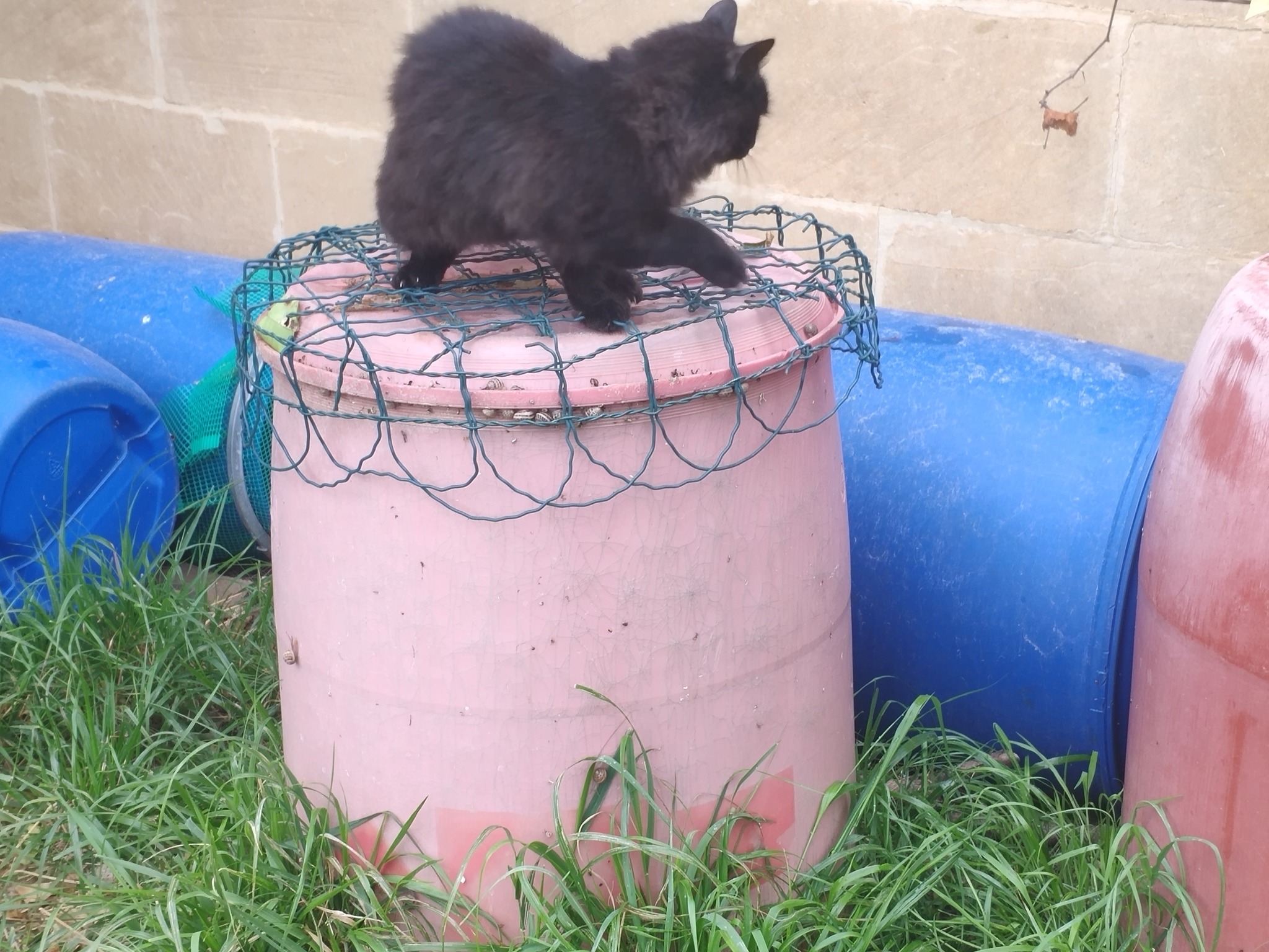 This was a wire top which fitted over the barrel when it was the other way up, to prevent the cats from falling in when the barrels were full of water. Raven was picking his way around the wire, treading only in the gaps.