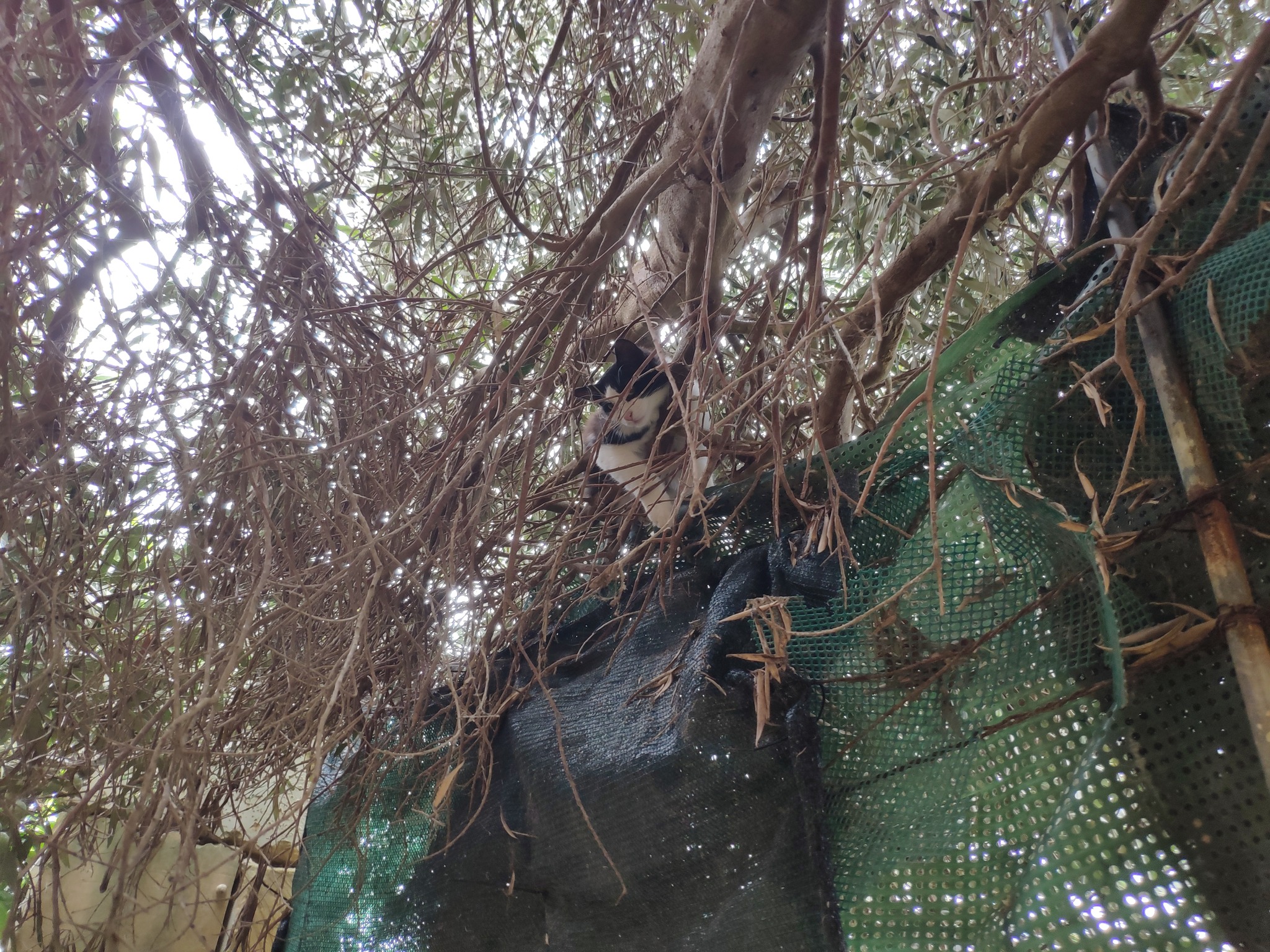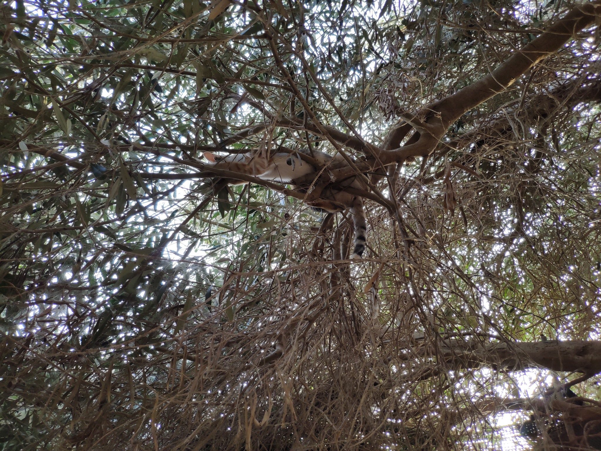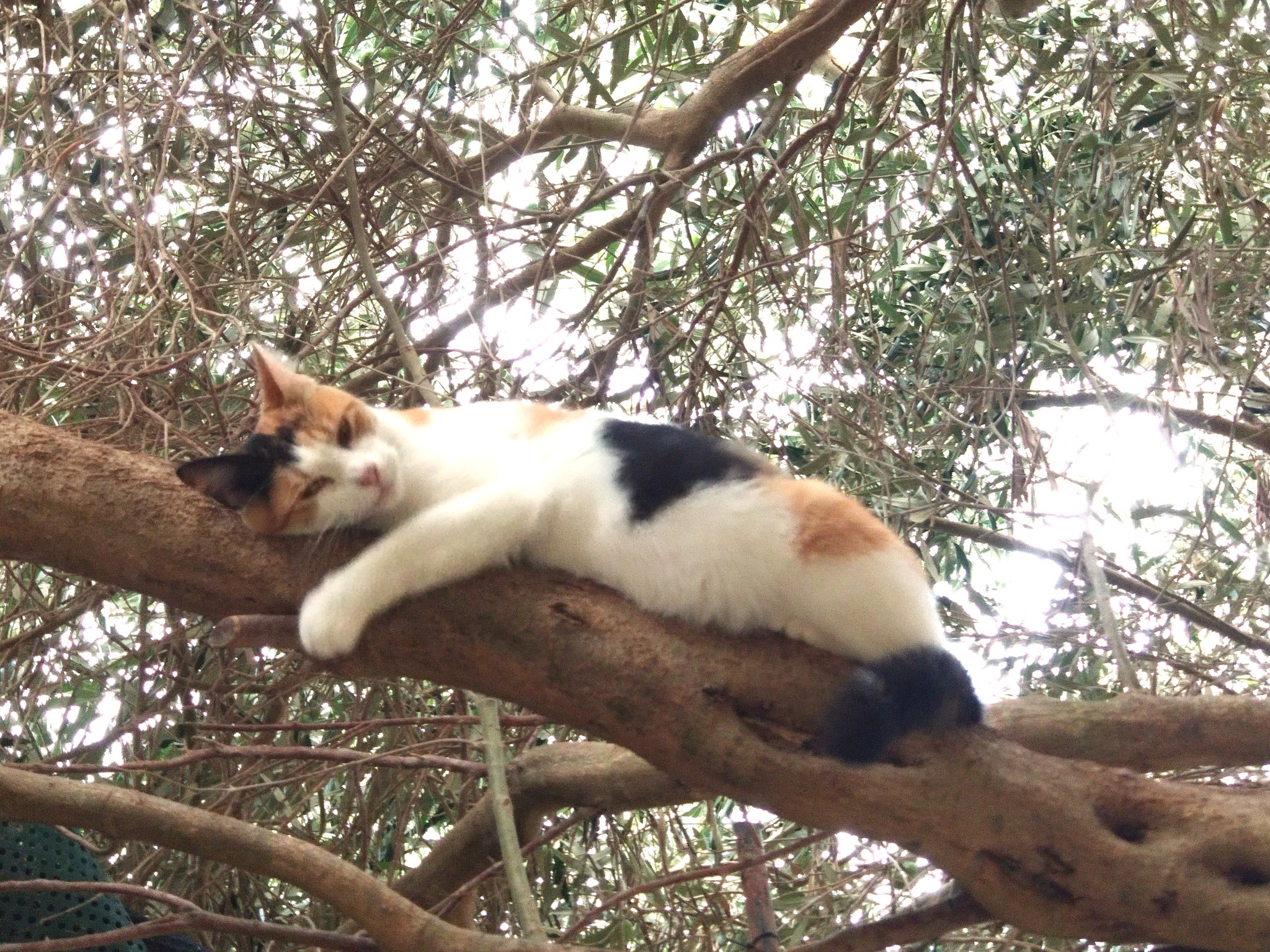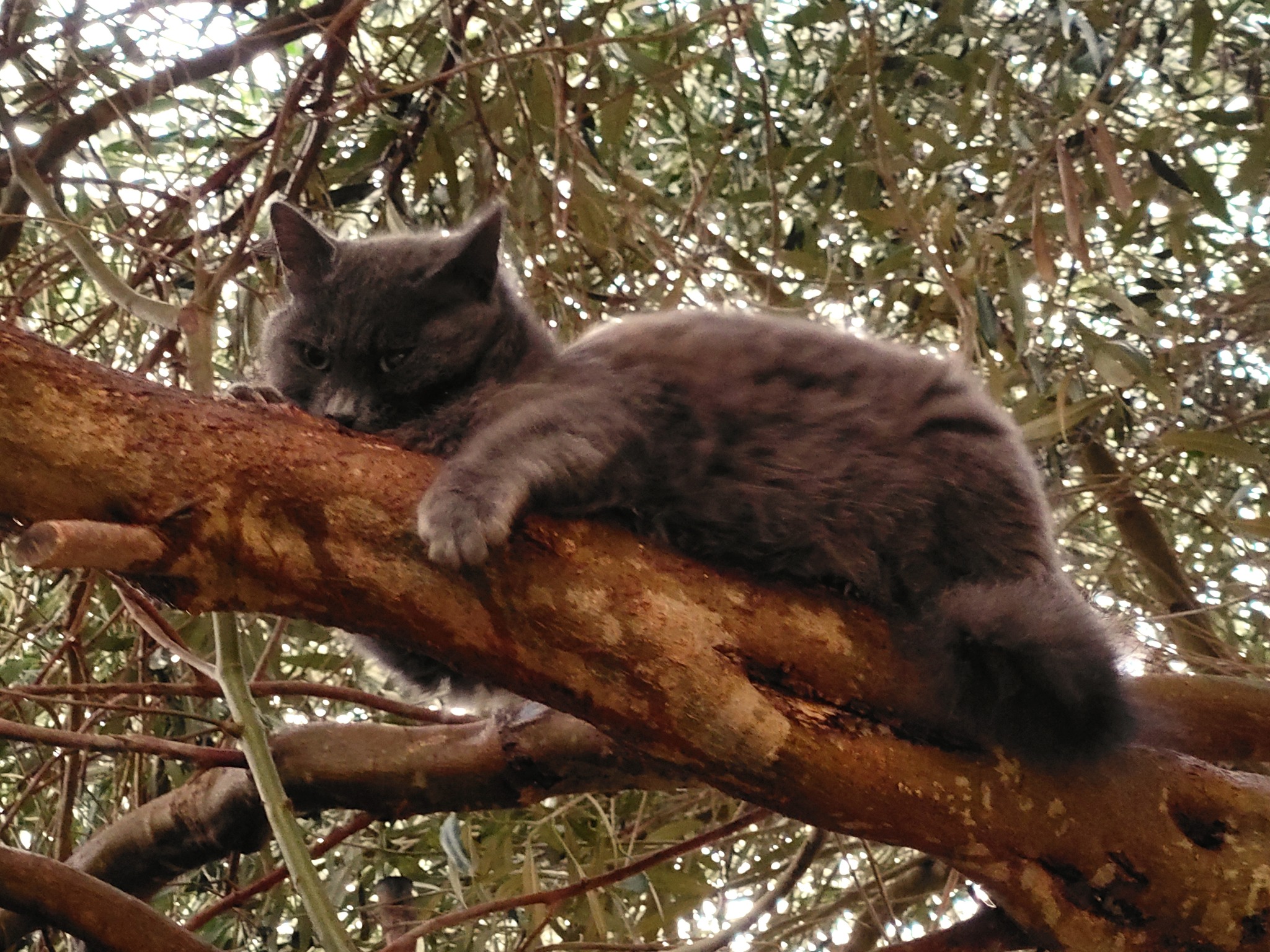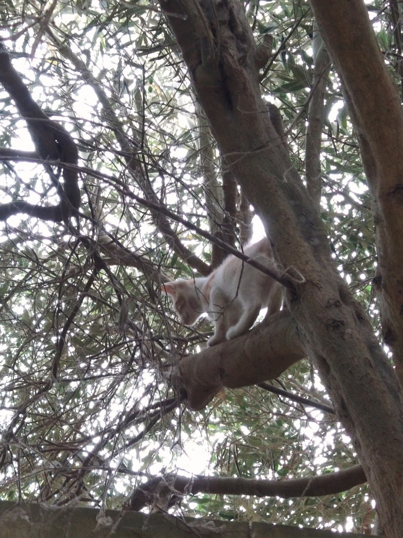 The olive tree was rooted in the garden but its branches stretched over a high wall, out into the drive. The cats used the tree to get from the top of the high wall down into the garden (and back up again) and, as trees go, it was a busy and popular tree for adults and adventurous kittens alike.