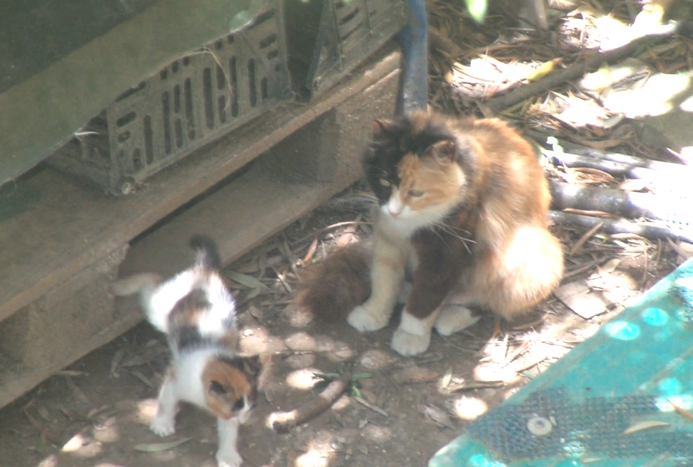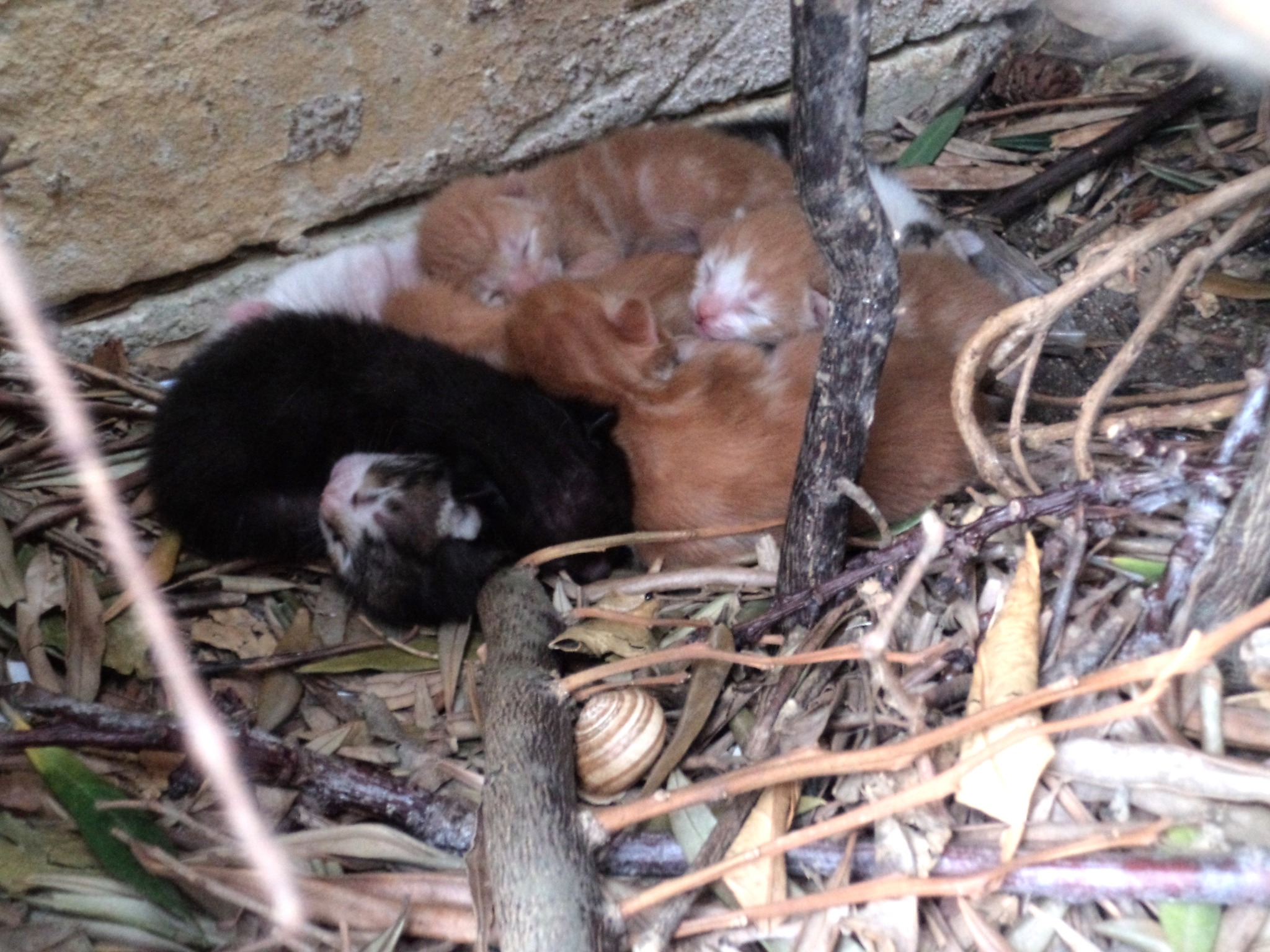 The following year, Sprocket became a mother a few days after The Cat had her litter. They formed a colony, bringing the kittens up together right from the very beginning, each of the mothers having given birth to four kittens. They were only a few days old in this photo.