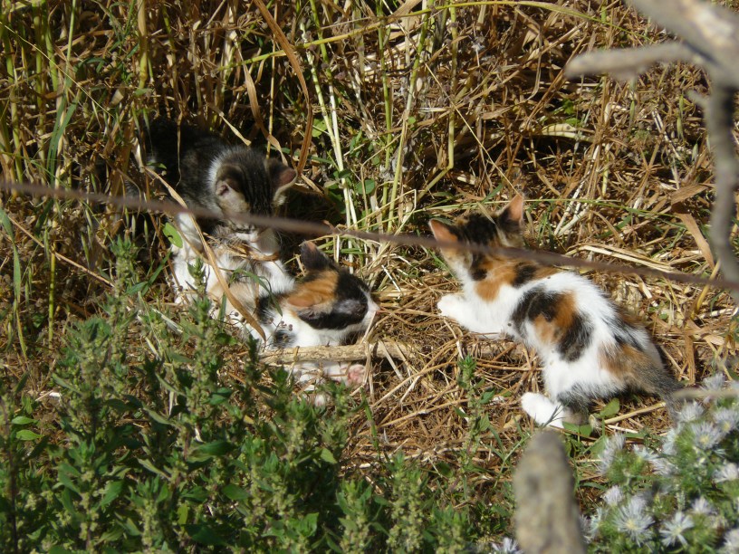 And, in the following days, we did indeed get to see Fleckle’s three siblings – Fickle, Fred and Drip. Fred was the only boy, the three girls were various tortoiseshell/calico shades. They were a happy family, spending their first weeks in the field and then being brought to the garden by their mother for weaning.