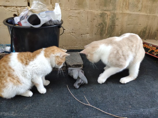 Here, the deadly duo was contemplating jumping up into a plant trough, probably with the murder of some greenery in mind. There was no point in being too precious about plants as there was a certain inevitability that the cats would lie in them, use them as toilets, chew them, and generally flatten them beyond recognition. It really didn’t matter too much – the cats were just busy doing cattish stuff.