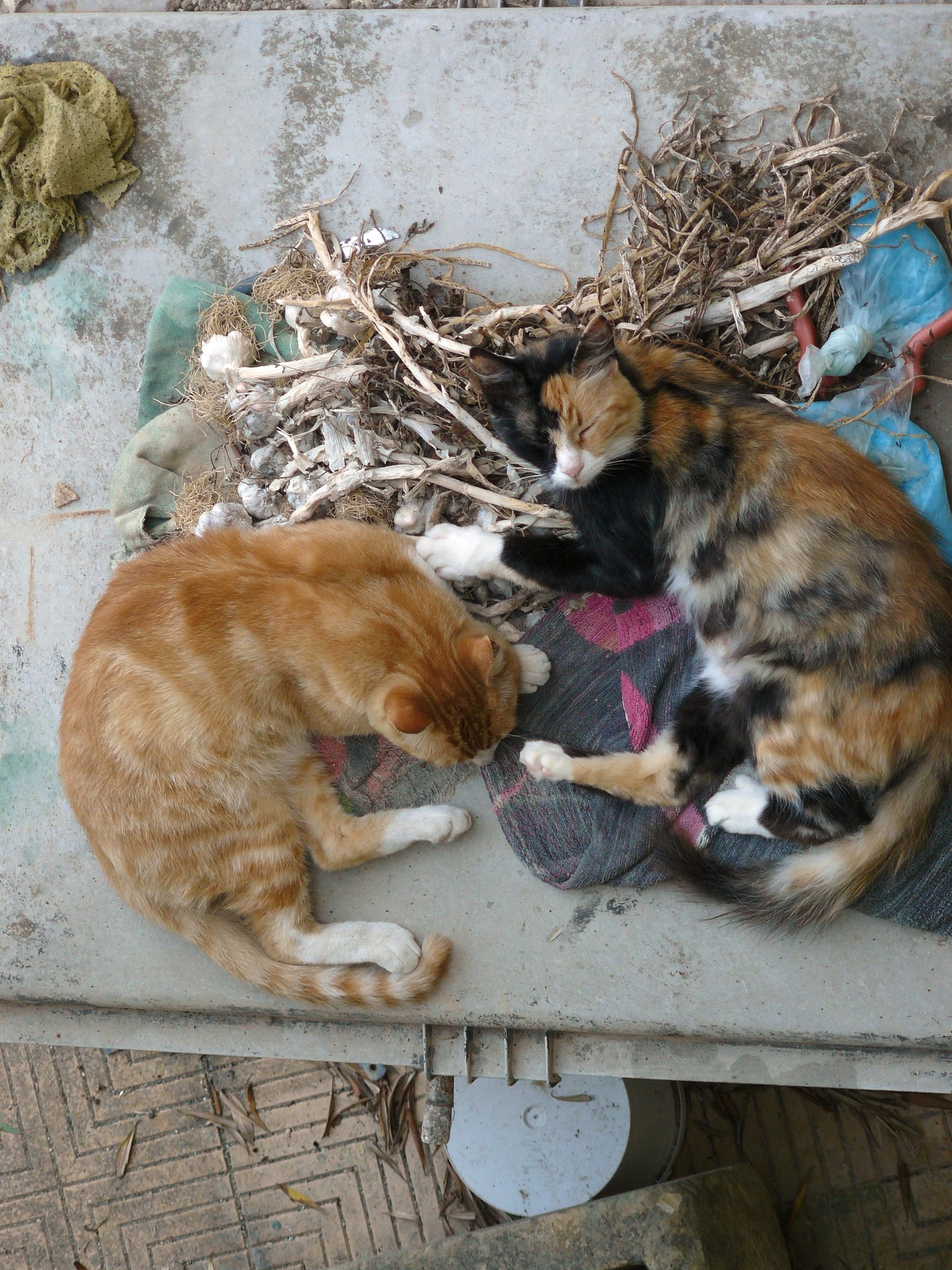 4. Working title ‘Hot Cats On A Bed Of Garlic’ – yes, of course there were much more comfortable places to nap but, for some reason, The Cat and Ana chose the top of an old water-tank where the garlic was drying.