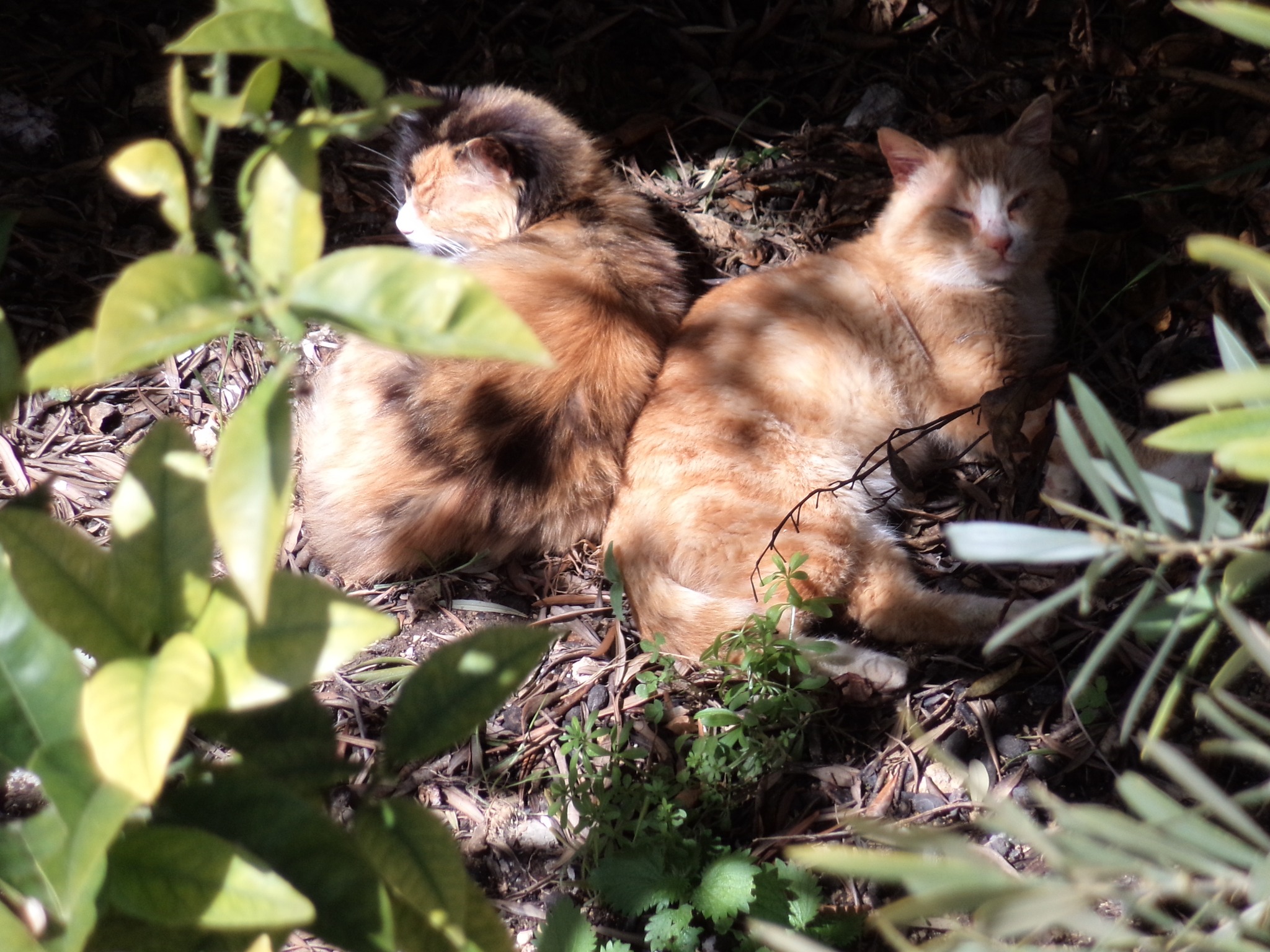 6. Echoing each other with their body shapes, The Cat and Ana (two very different cats, in almost every respect) were in perfect harmony, washing under the citrus trees and enjoying the contented silence that is born of longstanding love and mutual respect.