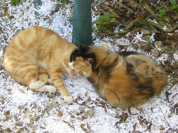 3. ‘Back to back they faced each other’, as the old rhyme goes – content in each other’s presence, The Cat and her Number One Son nap on dry leaves in the garden.