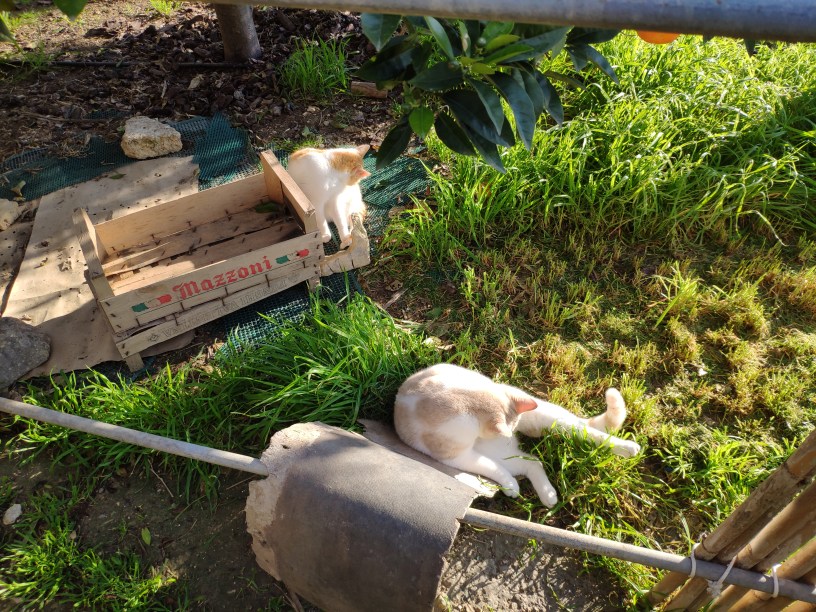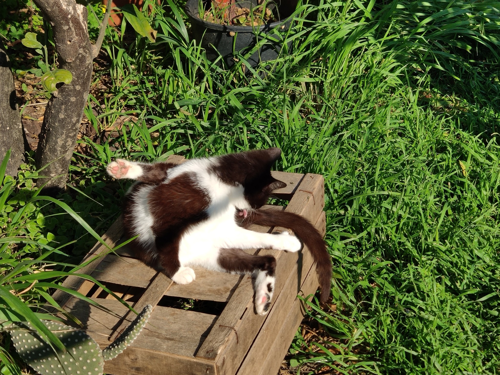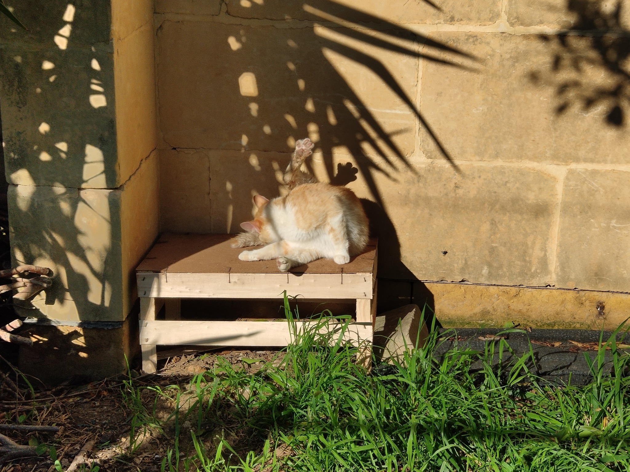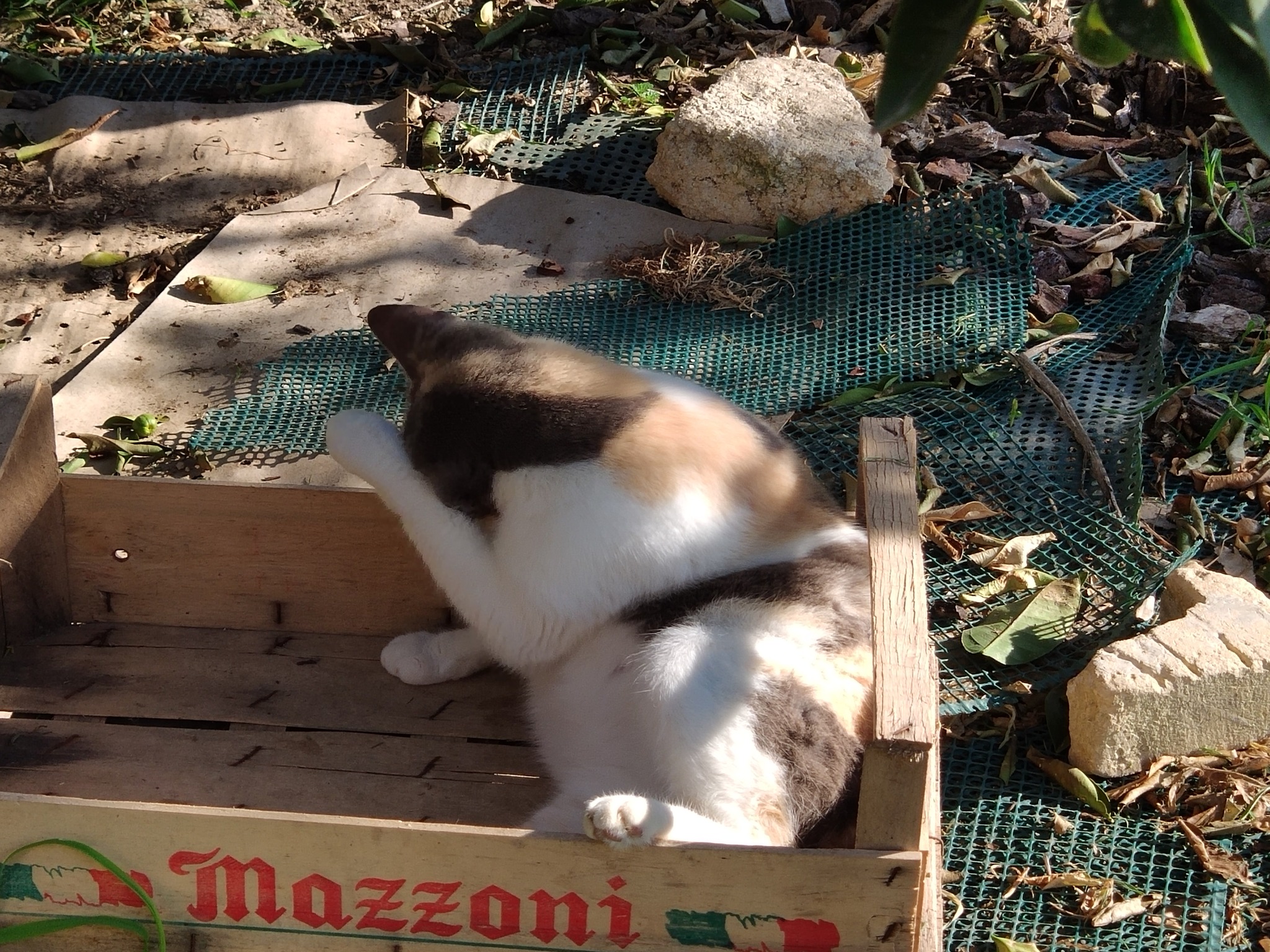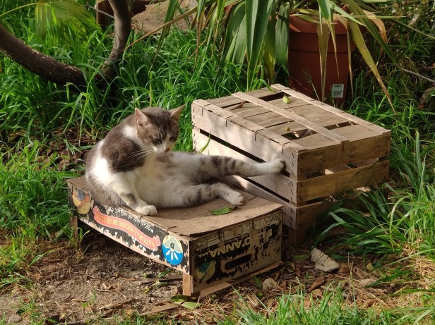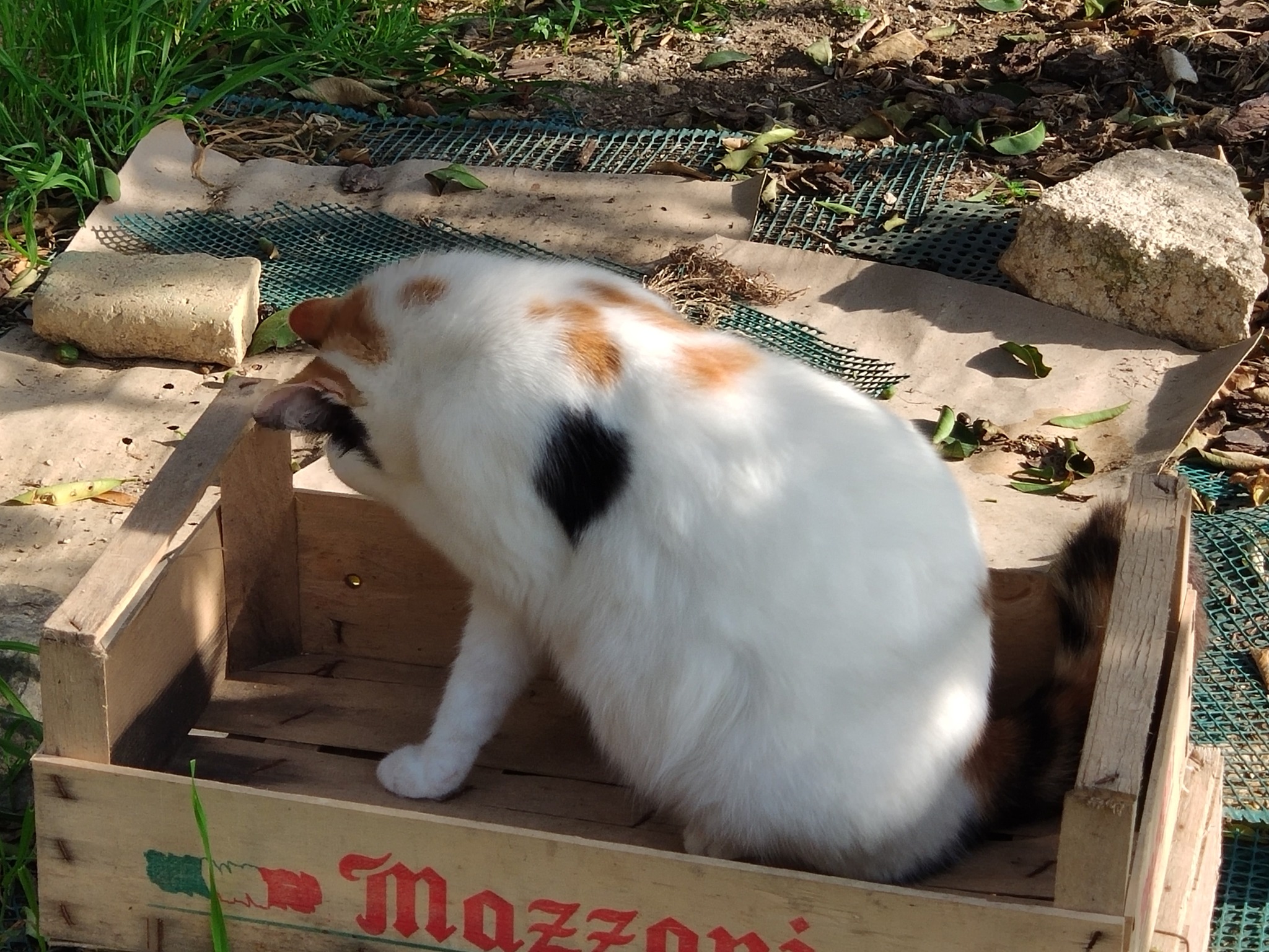 Spring-cleaning for cats? Well, probably not! but maybe because it was spring and the grass was longer and covered in dew, the cats liked to sit in an elevated position to have their after-breakfast wash. On a nice morning, they would head for boxes in different areas of the garden after they’d finished eating, and have a good wash in the sun.