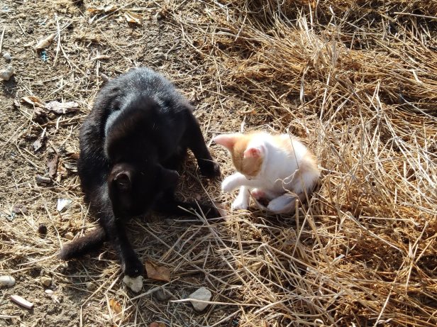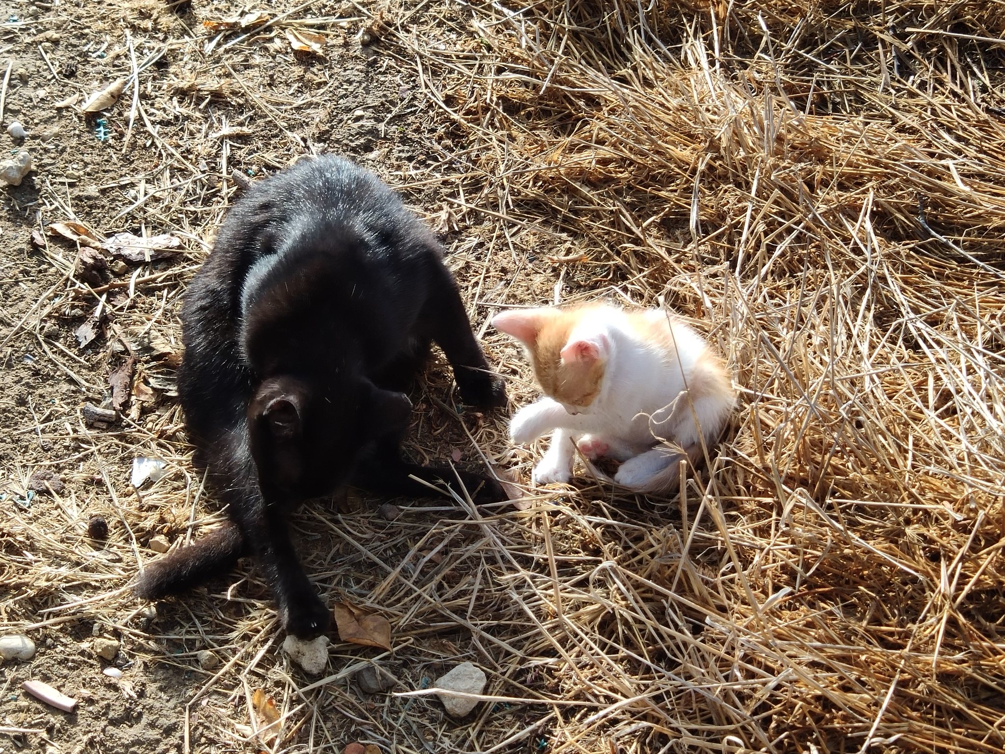 As a result, Sherpa’s health started to decline to the point where we were worried for his survival, so I placed him with Cheese, a female who had seemed tolerant of him, in the hope that she would accept him and finish raising him. Thankfully the plan worked – within four days, Cheese had taught Sherpa how to eat solids and drink water, she had cleaned him up and shown him how to groom himself, and was encouraging him through play to interact with the other cats and kittens in the garden. Thanks to Cheese, Sherpa grew up into a fine young cat.