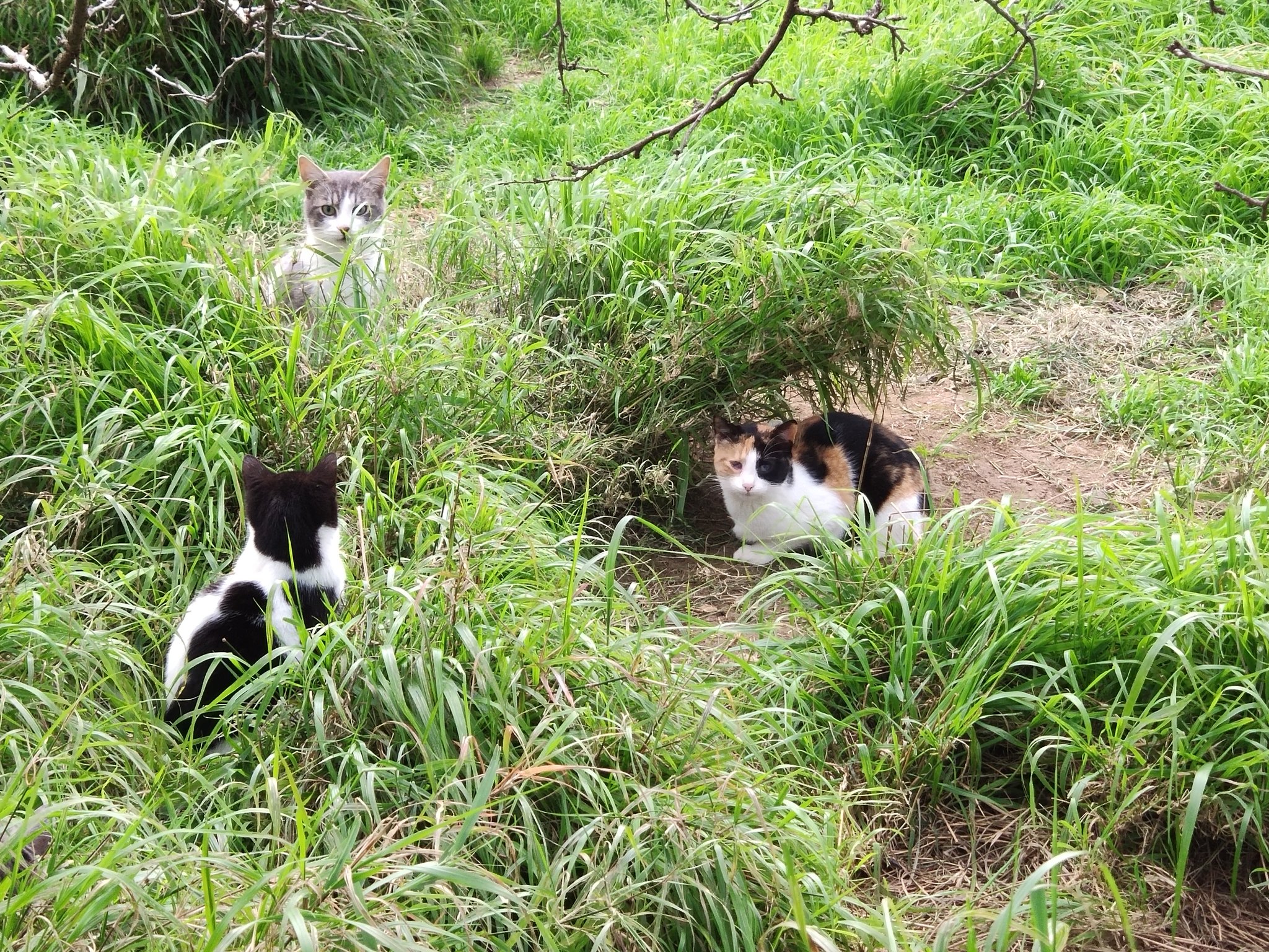 The downside of the longer grass was damp cats, especially in the morning, so we cut pathways for them so they could walk around without getting wet. But when the dew had dried, there were opportunities aplenty for the cats (especially the younger ones like Dandy Grey, Linnet and Moonstruck) to play their hide-and-pounce games.