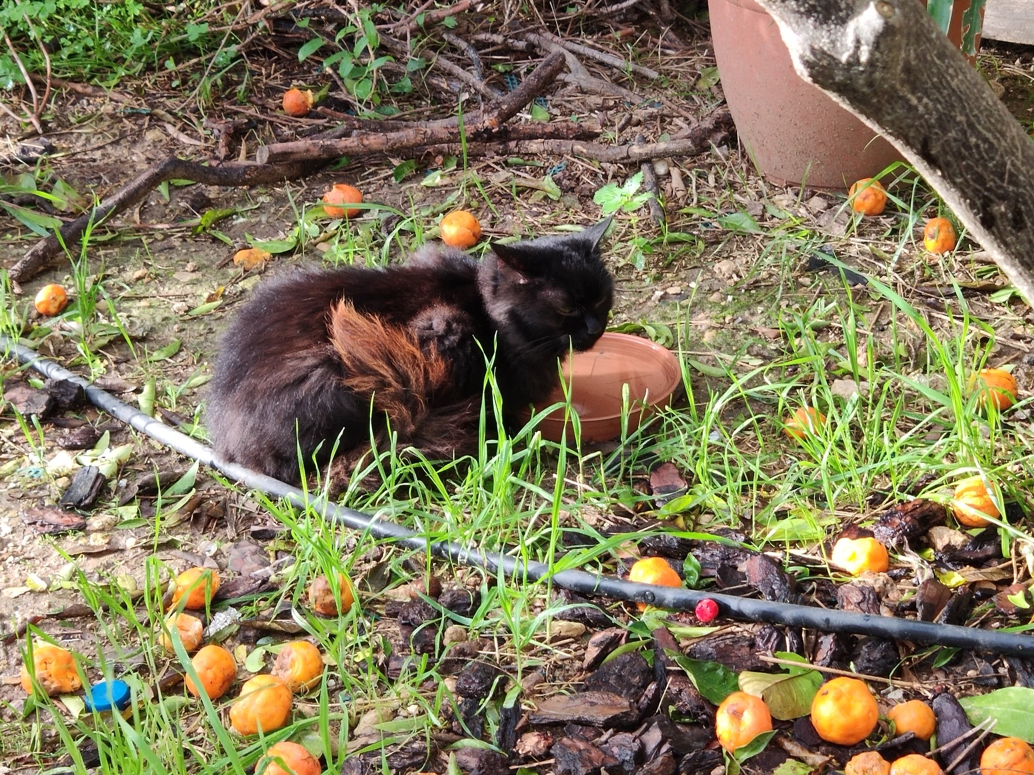 The last December in The Cat’s garden was quite typical weather-wise with a mix of rainy days, strong winds and some lovely warm sunshine in between. There were windfalls from the citrus trees giving a splash of colour (and occasionally delivering a bop on the head to a passing feline), and the grass and undergrowth was starting to grow after the rain. The cats had their winter coats and were well-insulated.