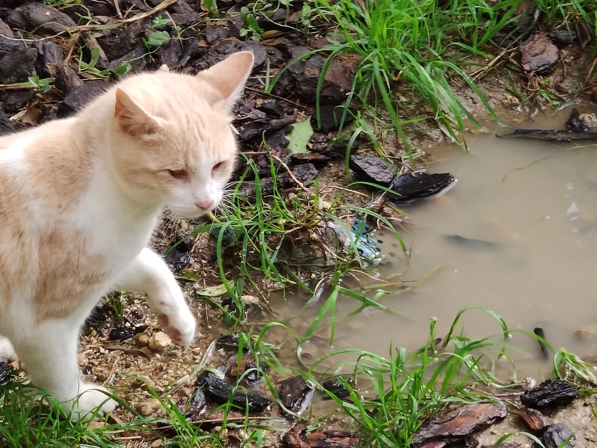 For feline connoisseurs, having a lovely muddy puddle from which to drink was obviously so much more tempting than boring bottled water or water from the well, although Pascha here was a little perturbed to find his well-trodden path from the feeding station to the verandah had become a lake following the rain. Drinking it was one thing – wading through it, quite another.