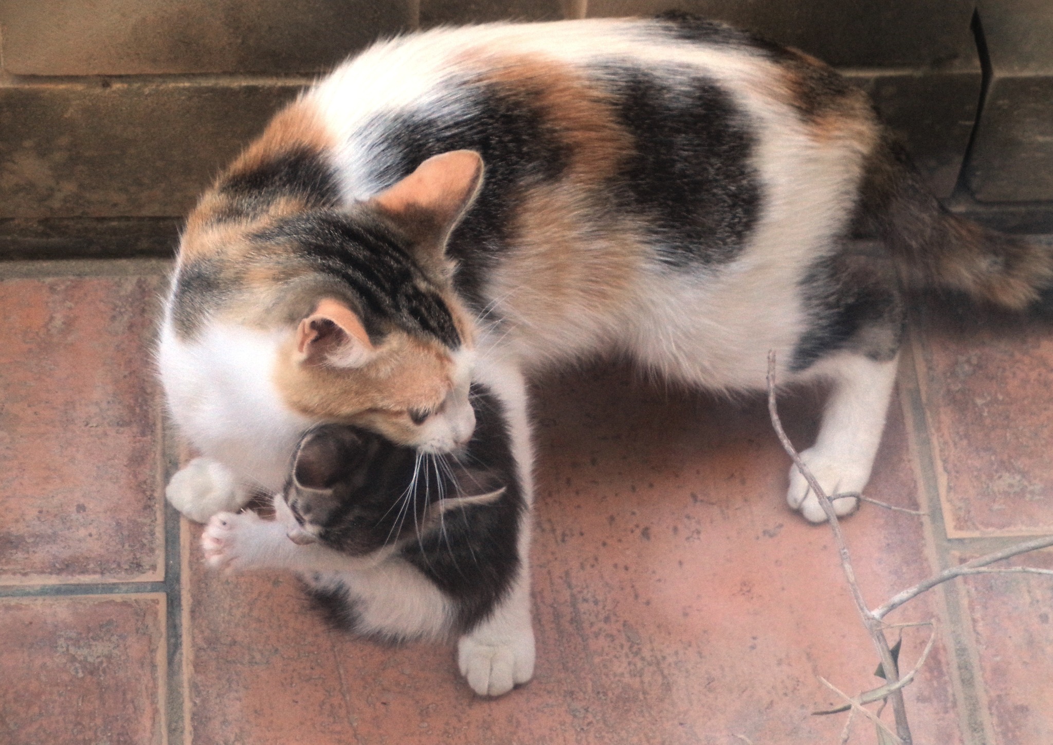 The Cat stationed herself right at the back of the pile under the branches and against the wall, presumably to care for the smaller, frailer kittens, while Sprocket looked after the stronger ones in their leafy den, and introduced them to daylight and the terrace.