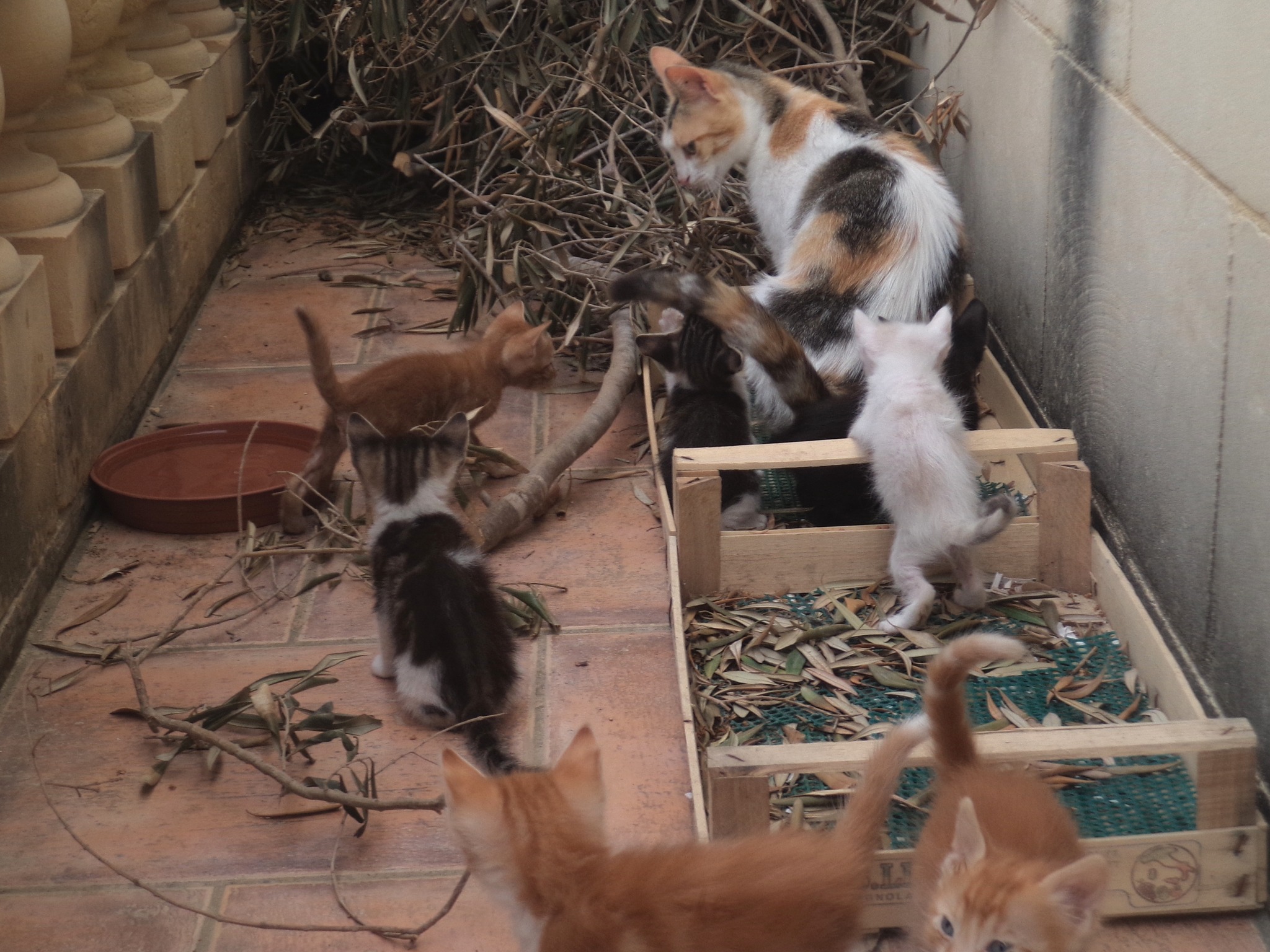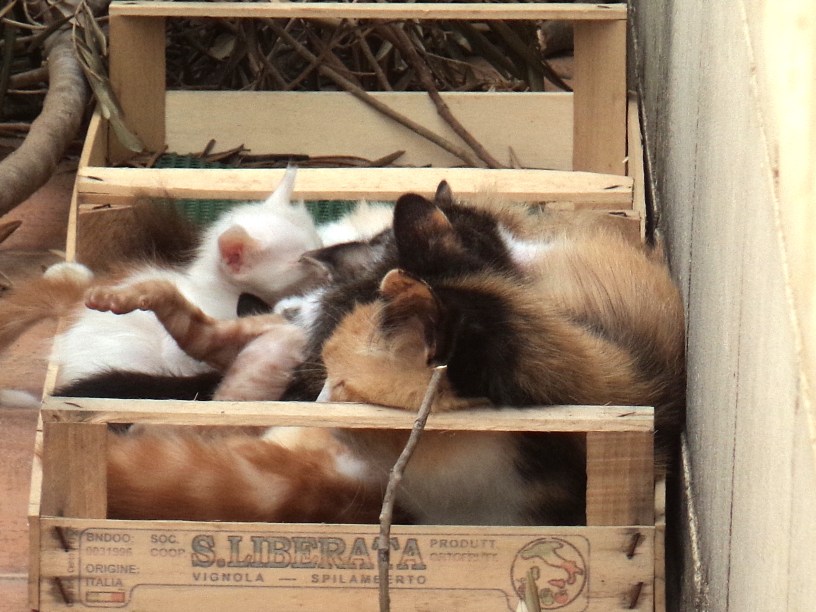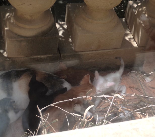After two weeks in the garden, we woke one morning to find Sprocket busily carrying the kittens to our first floor terrace where she tucked them away under a pile of freshly pruned olive branches which were waiting to go down to the garden. If we had been more diligent and taken the branches down as soon as we had cut them from the tree, we would never have been able to observe the feline family on our terrace.