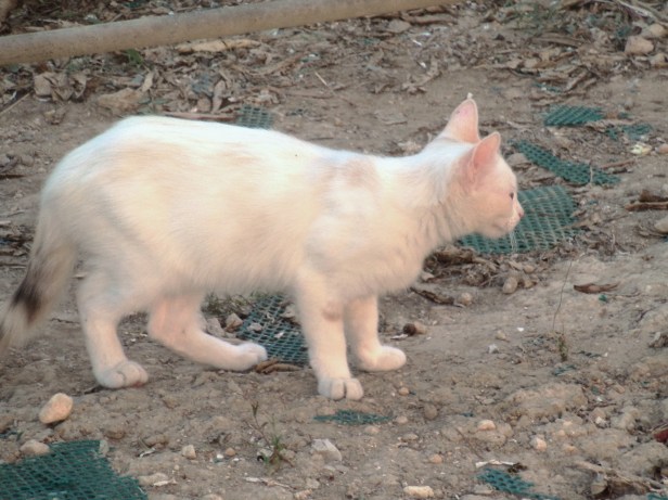 But she was in fact a very dilute calico kitten. Her tail was dark and banded with white, grey and pale peach, her eyes were blue, and her ears were translucent pink, tipped with peach. Her fur, although predominantly white, had quite large patches of pale peach and, as the weeks passed, it became fluffier. Here you can see her tail with its three colours, and some of the faint patches in her almost-white fur.