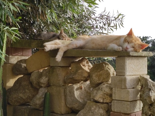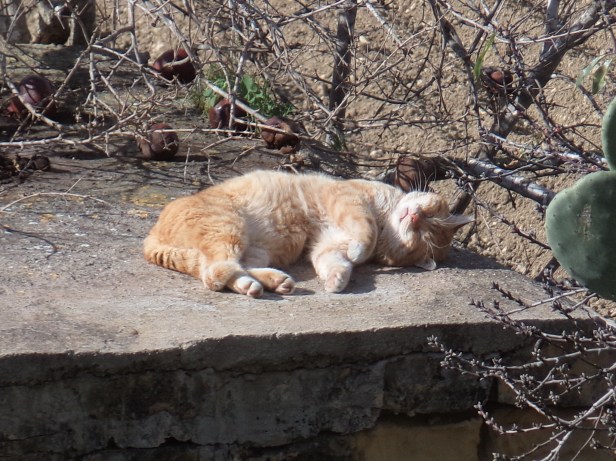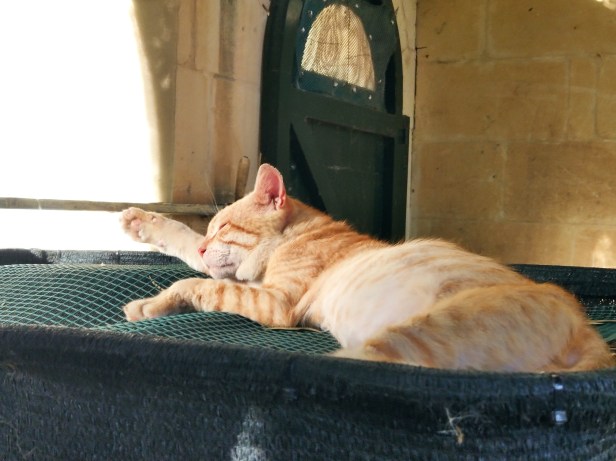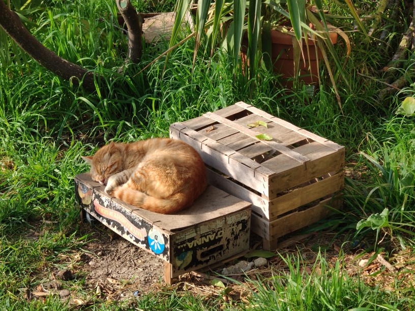 Saturday was one of the first orange Visiting Cats. The Cat had a soft spot for him and they would nap near to each other in the garden. By then, Ana Half-Tail had left his mother’s side and set off on his own adventures in the fields, no doubt in his own colony where he would be alpha-male, so there was a ‘vacancy’ for a new orange companion for The Cat. Saturday was a big, handsome cat and certainly not the sort of male who could generally be described as ‘cute’, but caught unawares napping in the sun on the roof of a farmer’s store in the fields, he did a very good impression!