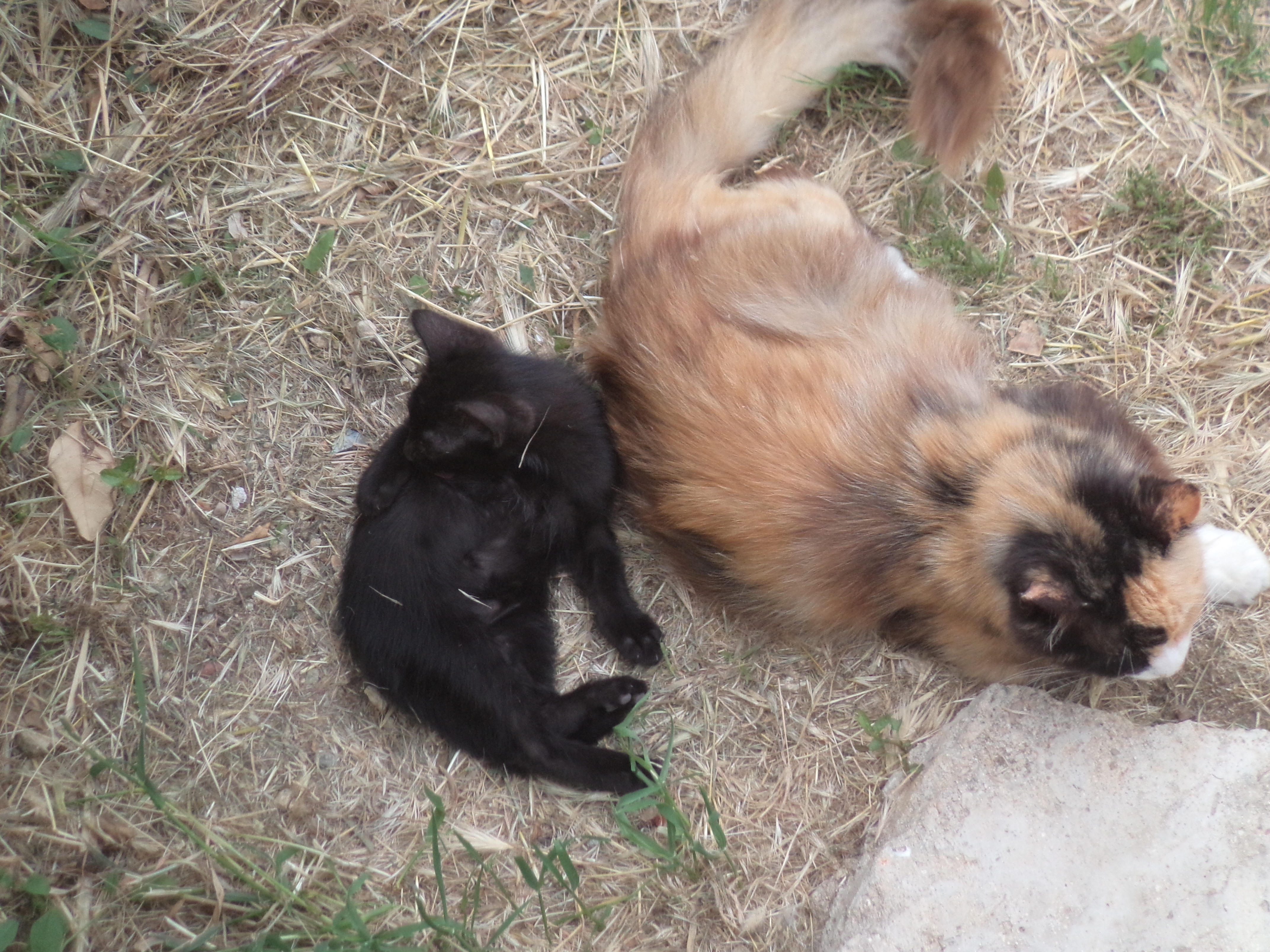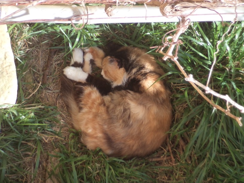 Flora and Furrileesa were to be her final family, and she chose to have them out in the fields, probably in a farmer’s storeroom or shelter. They spent their time between the garden and the fields, and we had less interaction with them than with The Cat’s previous litter. Flora Fourpaws was a calico kitten…