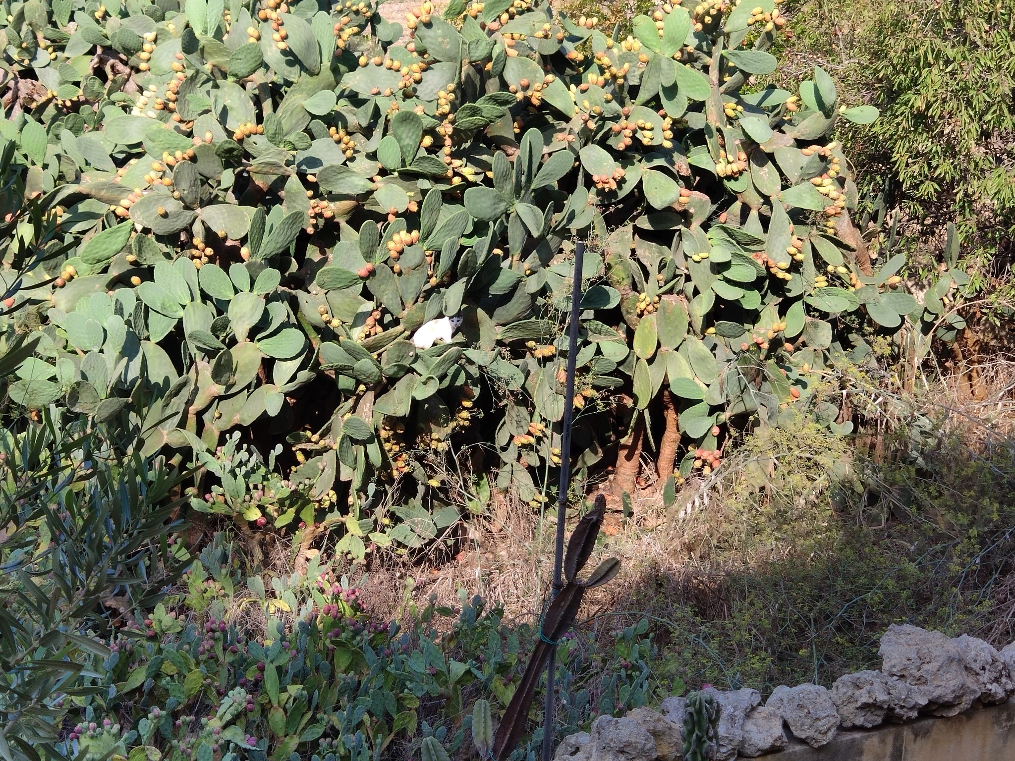 Sundown (pictured in the next photo) was the daughter of She-ba, Visitor’s daughter and, although she became a member of The Garden Family, her roots were strongly feral and she was never completely comfortable with humans around. She much preferred to be in the fields, here photographed in the prickly pear shrubs which divided the fields into their sections.