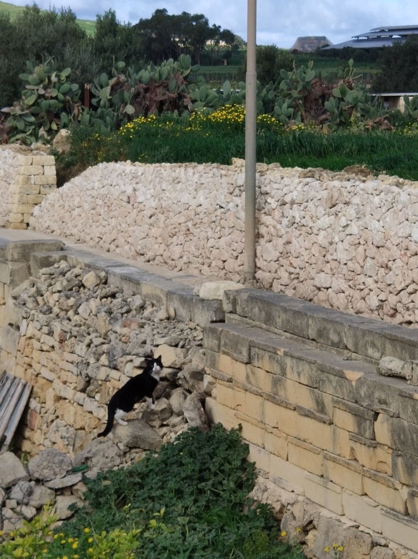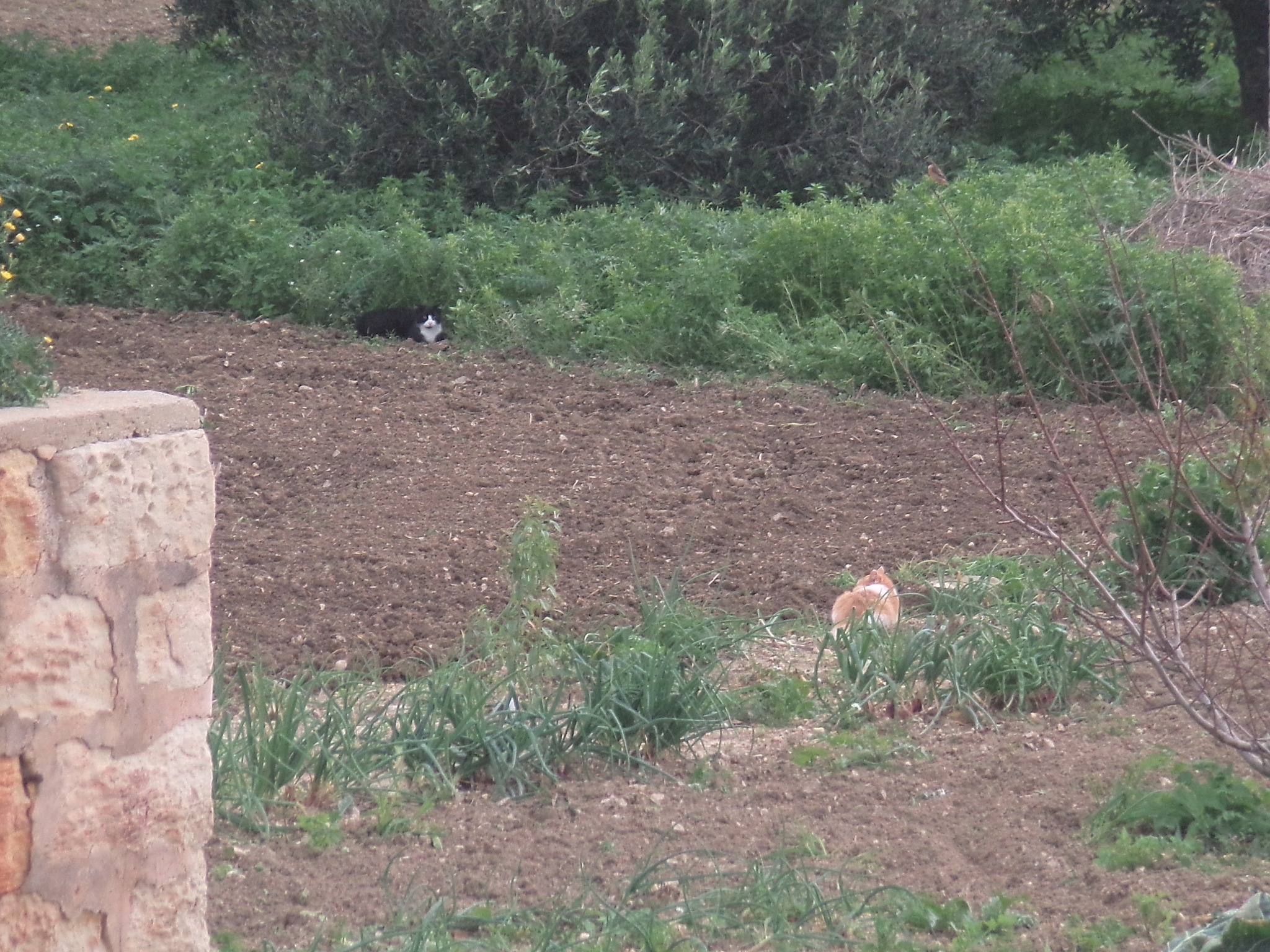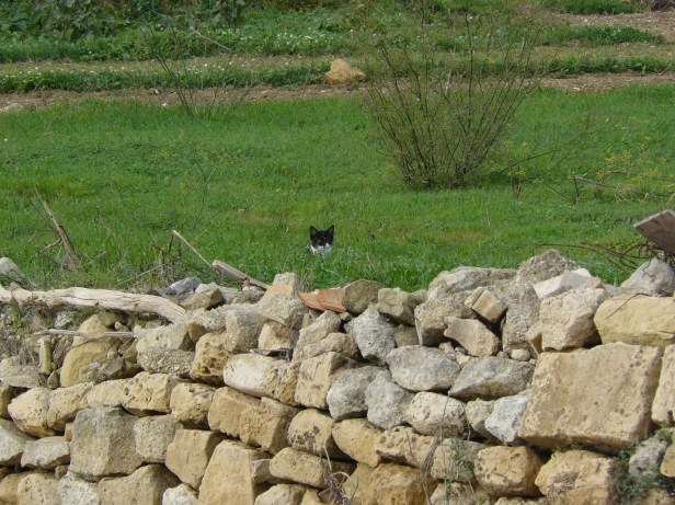 Next is T, who was an example of a kitten of a Visiting Cat who had decided to make his home in the garden. He was Visitor Cat’s son, born in the fields with his siblings. Visitor brought them to the food bowls in the drive and front path for weaning, and the kittens soon found their own way into the garden via the wall and olive tree. T and his twin sisters Cheese and Cracker became members of The Garden Family while their mother remained a Visiting Cat. The photo shows T in the fields at the side of the garden with an unidentifed orange-and-white cat – someone we did not recognise.