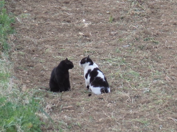 At the other end of the scale were alpha-male cats such as NVQ, whose approach was less subtle. Sometimes NVQ would lie in wait and blindside his victim, other times he would go for the full-frontal attack. And he was a ferocious fighter. Here NVQ faced Longtail in the fields. Both cats had their ears back, hackles raised, and were wailing loudly and poised to attack (despite being seated). In fact, a few moments later, NVQ attacked and they literally leapt as one, attached to each other by teeth and claws, into the grass on the left of the photo. There was a brief but vicious fight, and then they both shook themselves and walked away.