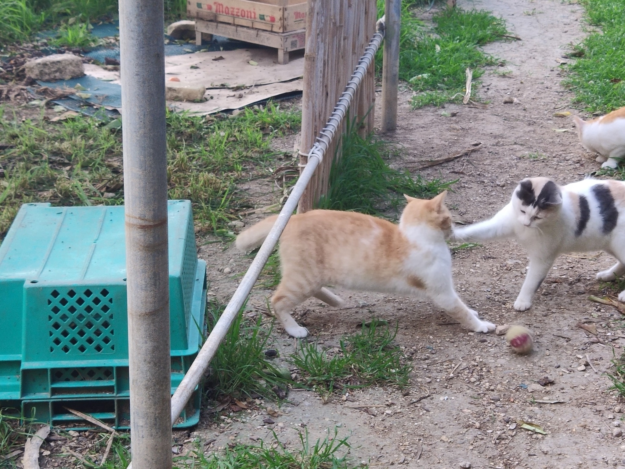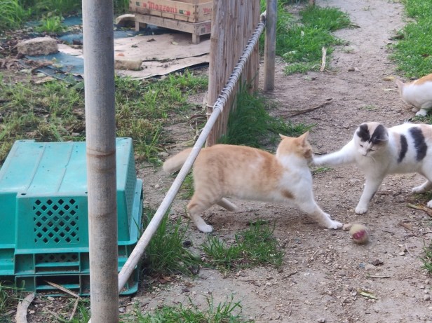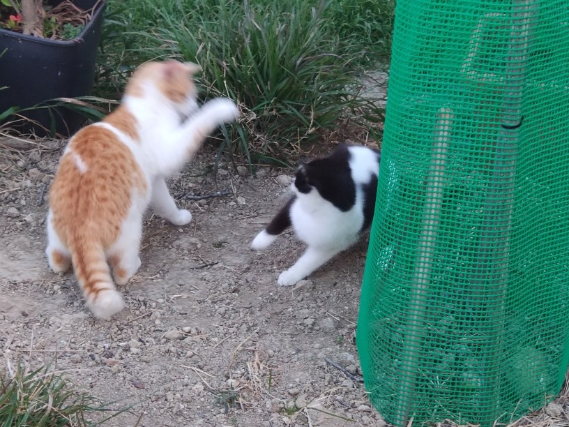 Although the cats didn’t really need any toys, having an entire outdoor world at their disposal, they were lucky to be the beneficiaries of gifts which human friends sent to them. The felt balls with jingles inside were a firm favourite, and definitely worth fighting over (as Satsuma and Sundown were demonstrating here).