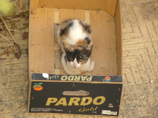 There was a vegetable box in the drive in which The Cat liked to lie and, when she wasn’t there, the kittens soon took it over. One small kitten, one big box – Ratchet must have felt so very grown up.