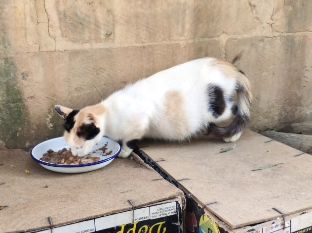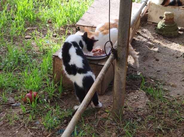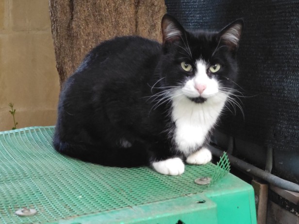 An example of the first was Moonstruck. Born to She-ba in the fields, Moonstruck and siblings Sundown and Cosmos came to the garden for weaning. Moonstruck was black and white and there really can be no doubt that she was the daughter of neighbourhood alpha-male NVQ, with that trademark white patch in the middle of her back. (Cameo appearance at the food bowl is courtesy of Sherpa.)