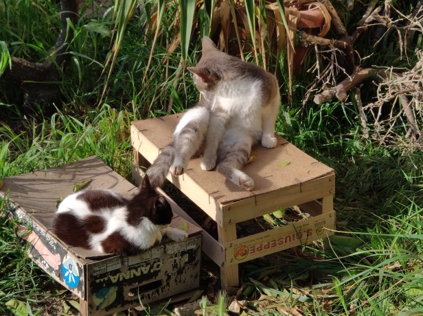 Pascha relaxing in the morning sun on top of a pile of twigs and branches. This looked so uncomfortable, but all the cats loved these piles of sticks and, out of all the garden, chose to lie here.
