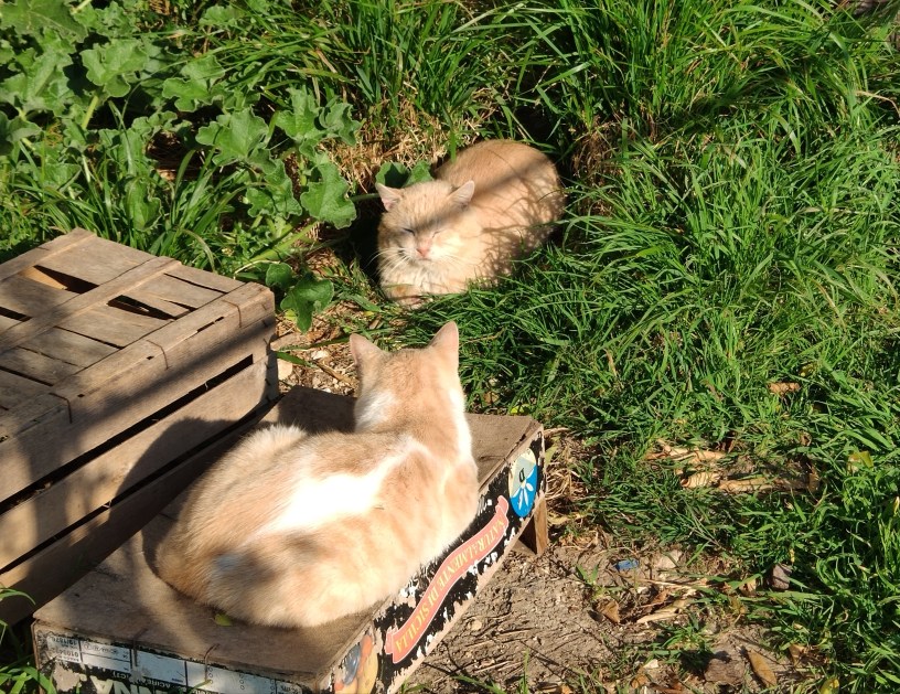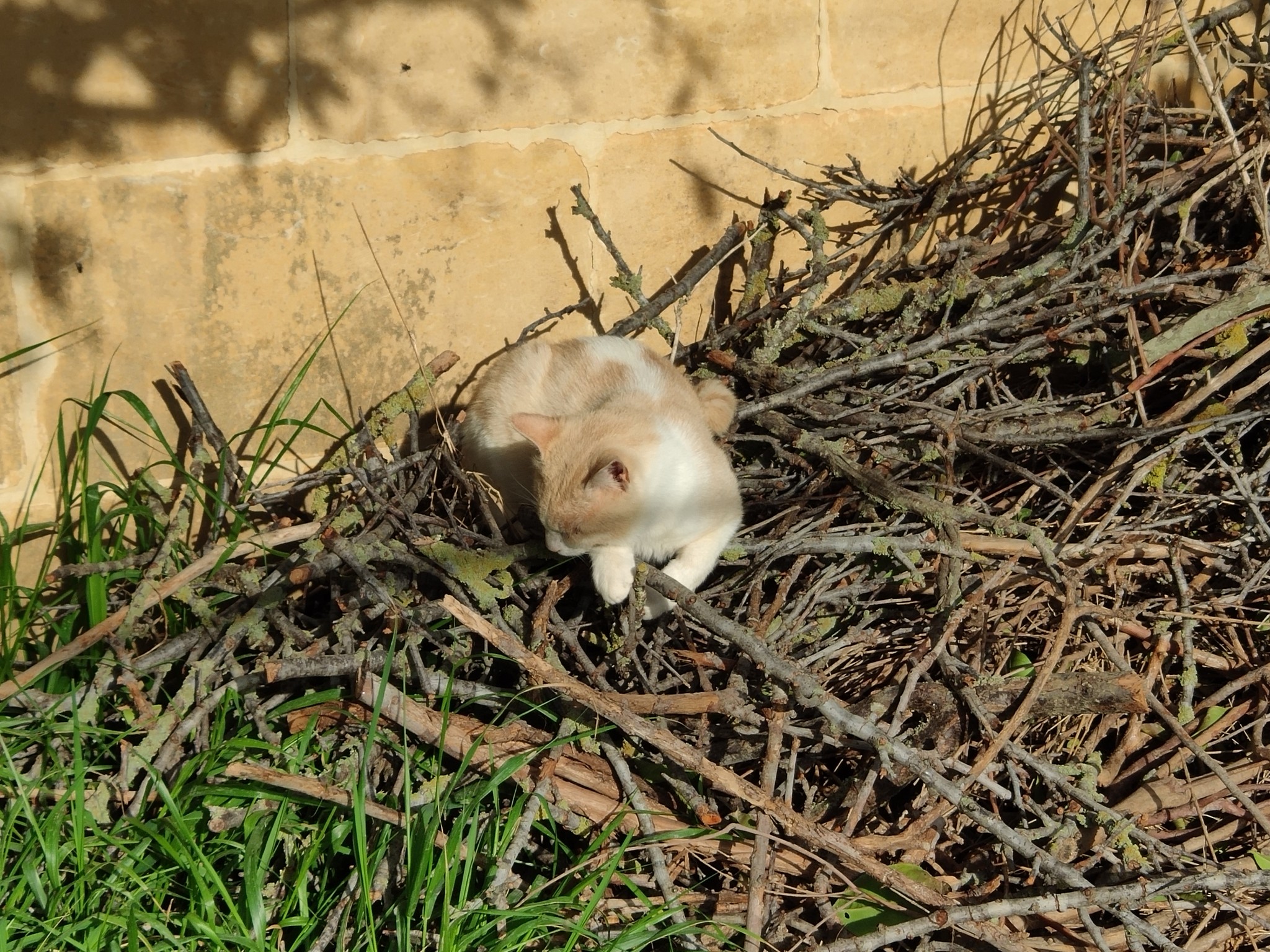 Pascha relaxing in the morning sun on top of a pile of twigs and branches. This looked so uncomfortable, but all the cats loved these piles of sticks and, out of all the garden, chose to lie here.