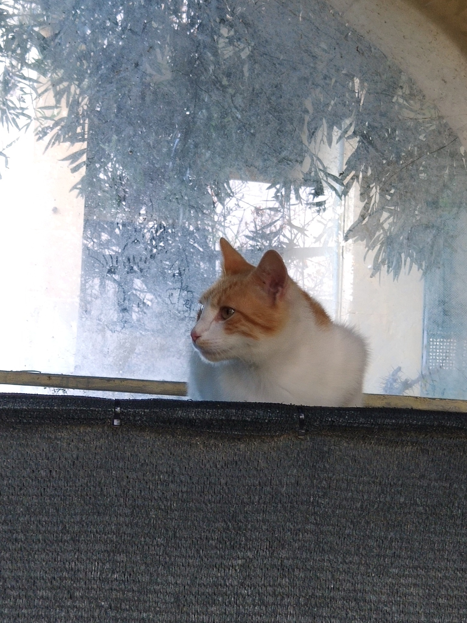 Sherpa on the water tank under the olive tree. Note all the paw marks on the window! He was looking forwards the olive tree trunk so there was probably someone coming up or down.