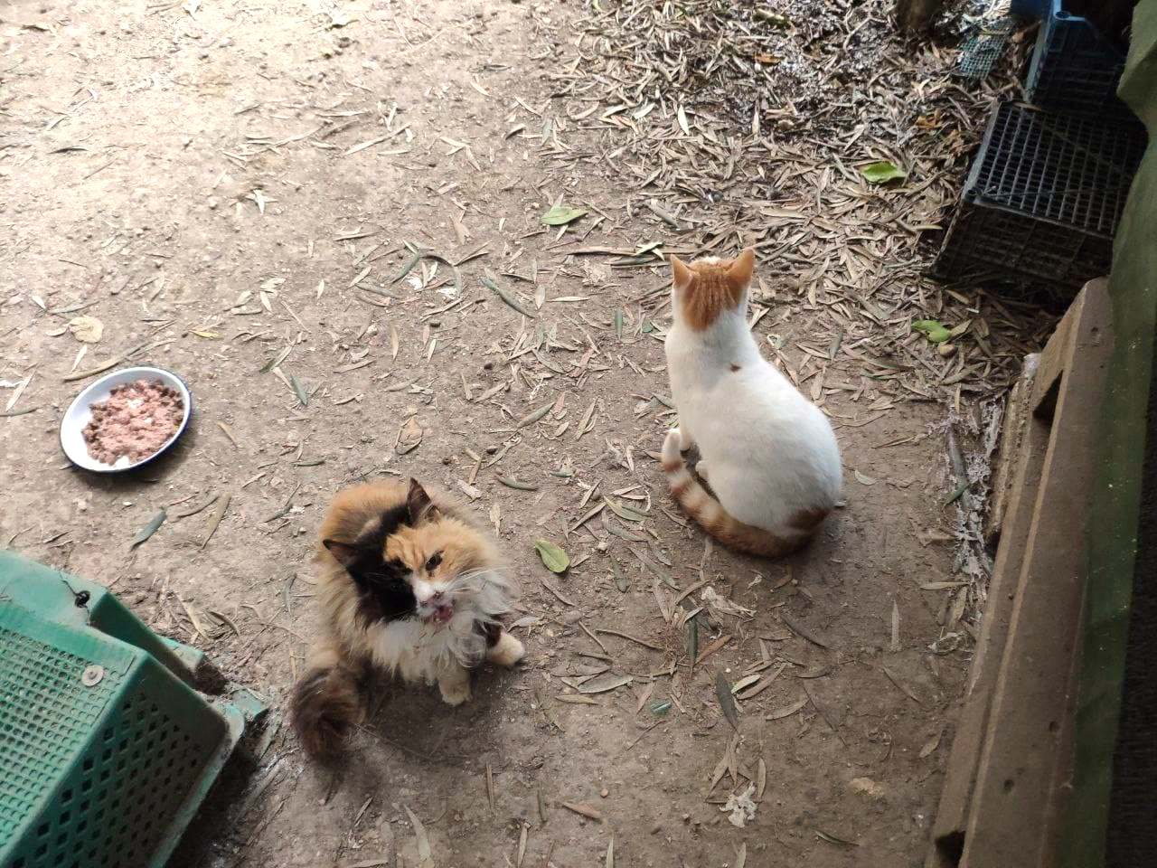 2021 – this photo was taken only a few weeks before The Cat passed away, in front of the feeding station with grand-daughter Calypso. The Cat had been suffering from mange, although the treatment was working. Although a spot-on treatment was possible (with some careful planning), cleaning her face and eyes was definitely not something that she would allow.