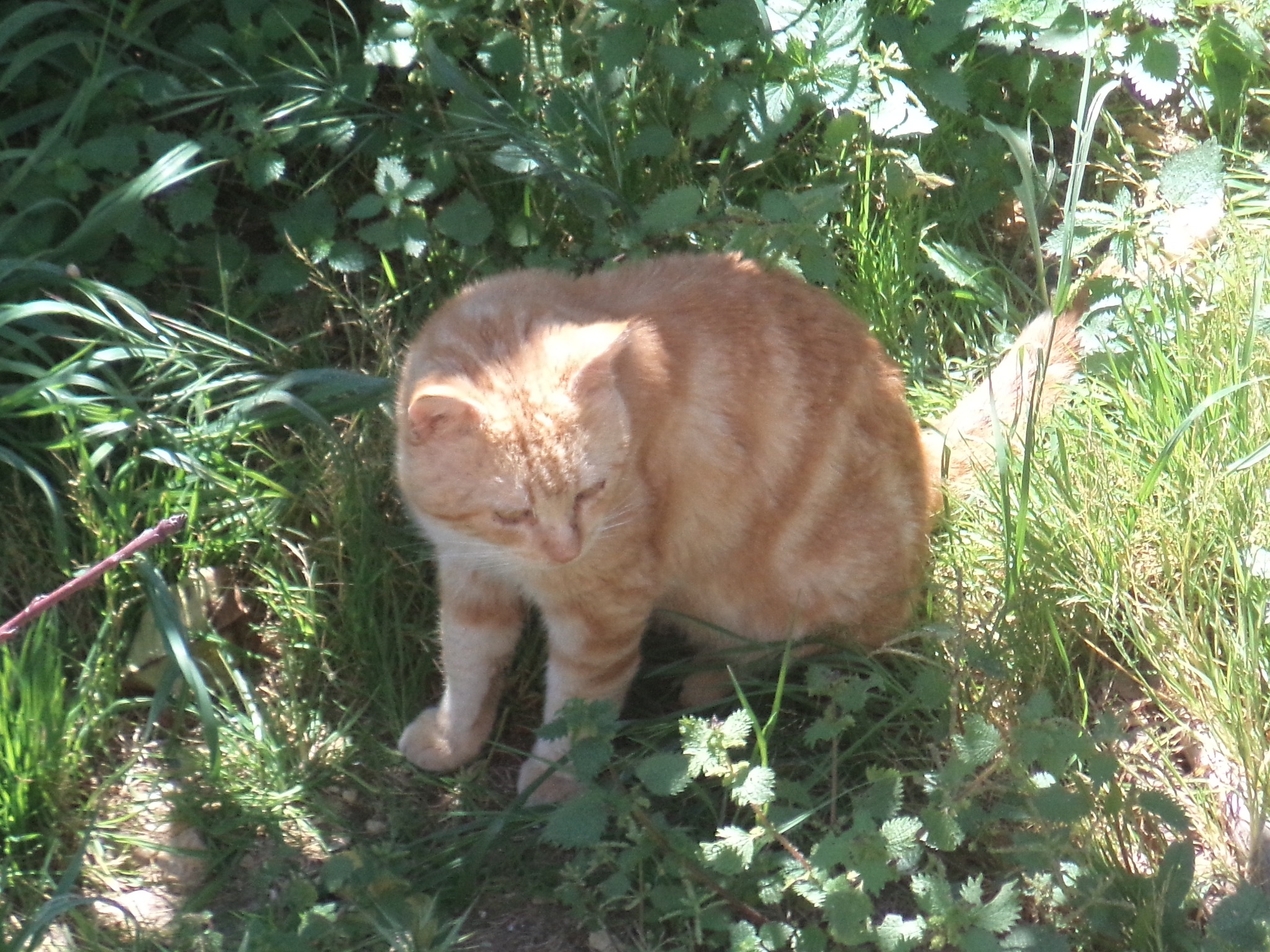 The following year saw four alpha-males in the neighbourhood. As regards the orange cats, Saturday had moved on, but G7 was still around. G7 had originally come from the direction of the other garden over the fields where cats were also fed, so, although he wasn’t friendly, he was accustomed to having humans around. This meant that, unlike most of the other males, G7 was happy to spend time in the narrow front path where humans might need to walk past you.