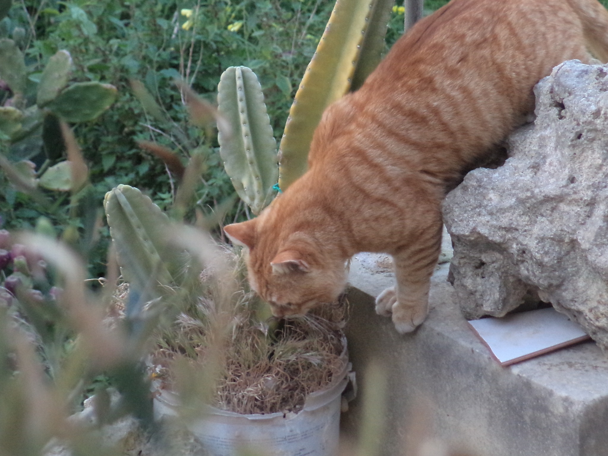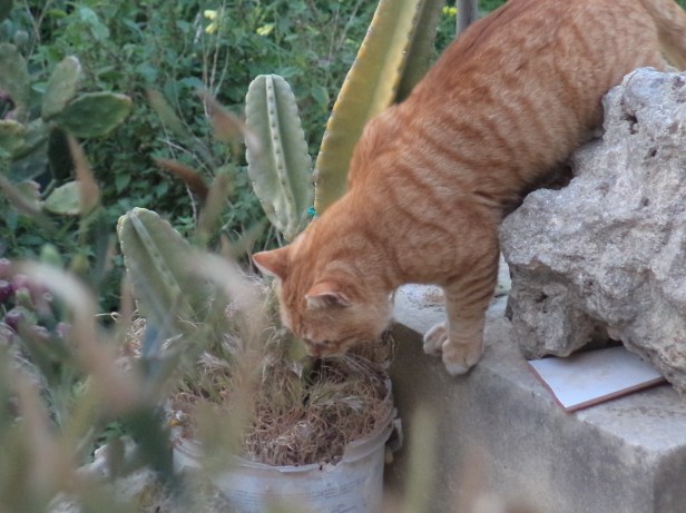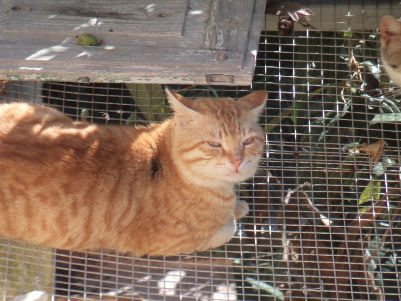 Izit appeared out of the blue one morning at breakfast time. He was a large adult male with longer fur than some of the others, and pale orange or peach in colour. He was feral and kept his distance from the humans, pausing only to advise us that his name was Izambard The Italian, but we could call him Izit. It was obvious from his posture and bearing that he felt he moved in the alpha-male circles, and was not afraid to take on the likes of NVQ and Mr Bright.