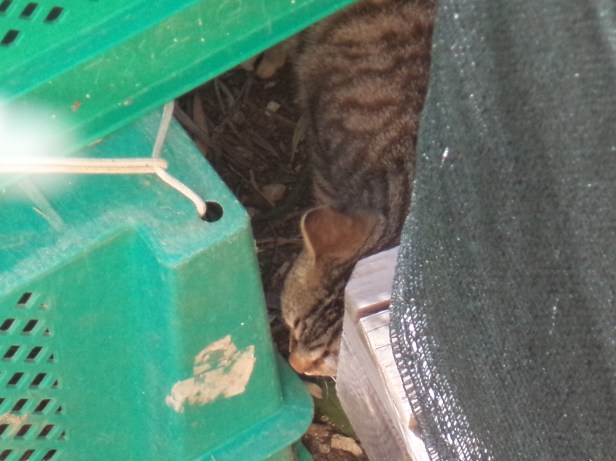 Dinky’s casual pose did not last for long and soon he was cowering behind the green plastic crates before making a well-judged and imperative exit back up the tree and back to the drive.