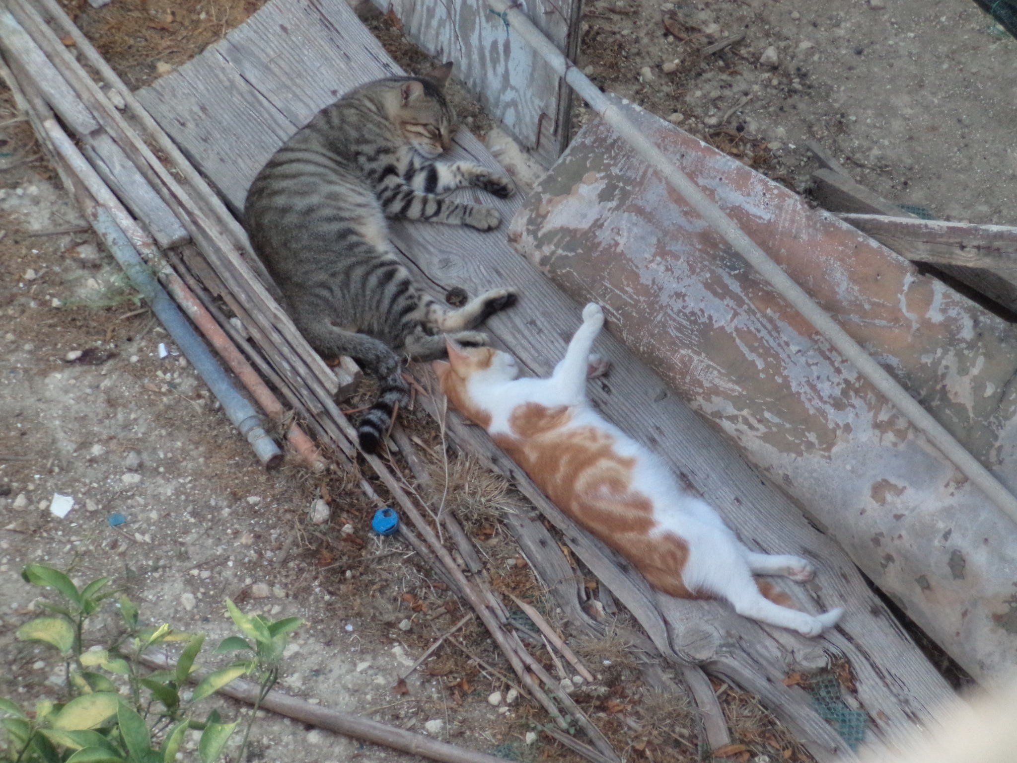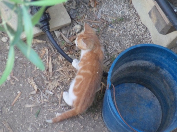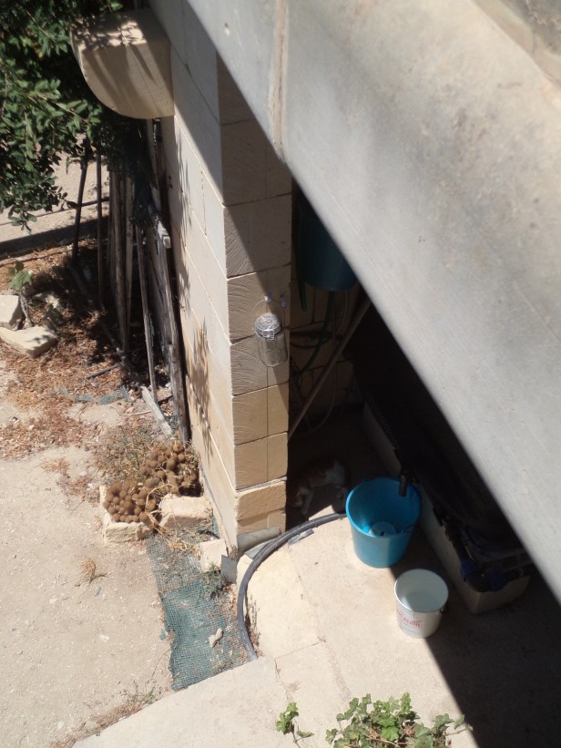 Lightning hid behind a water tank for a week. You can just see him here, lying behind the blue pail next to the water tank – close enough to run quickly and hide if the need arose.